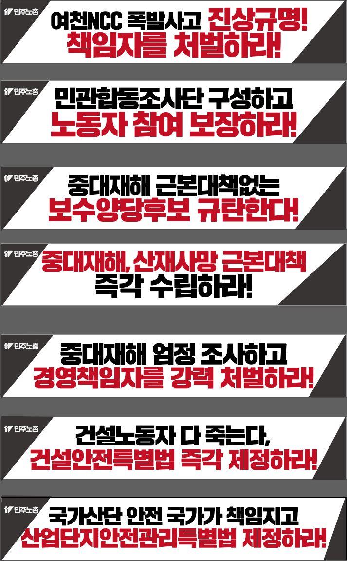 해당 웹자보는 여천NCC 폭발사고의 진상규명과 책임자 처벌을 요구하고 있다. 민관합동조사단 구성 및 노동자 참여 보장을 주장하며, 중대재해에 대한 근본 대책 없는 보수 양당 후보를 규탄한다. 또한, 산재사망 근본대책 즉각 수립과 경영 책임자 강력 처벌을 촉구한다. 건설노동자 사망사고를 막기 위해 건설안전특별법 제정을 요구하며, 국가산단 안전에 대한 국가 책임을 강조하고 산업단지안전관리특별법 제정을 주장한다.