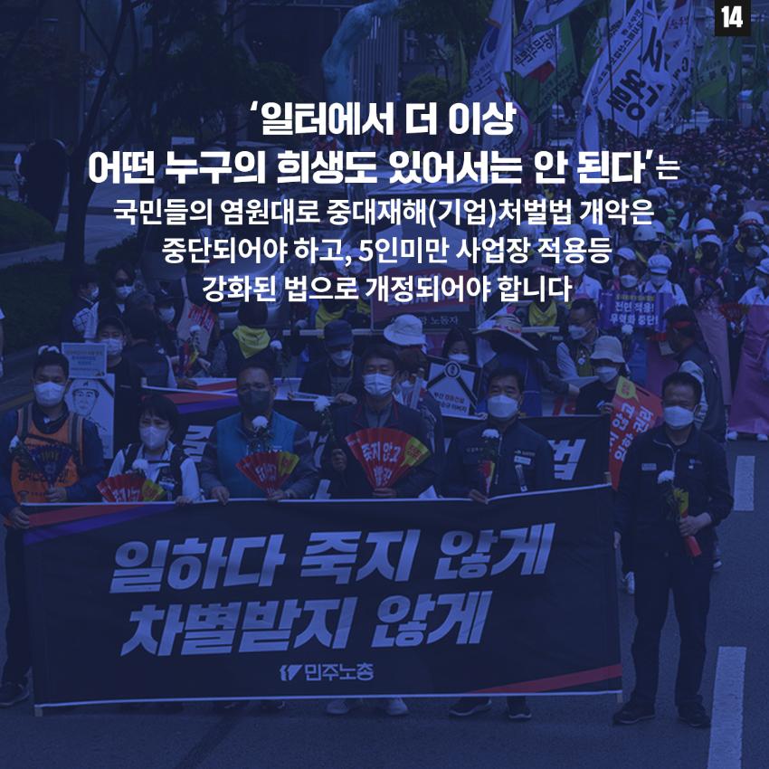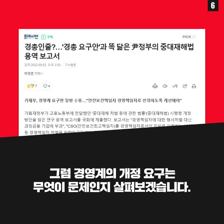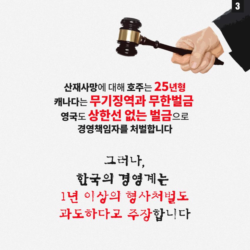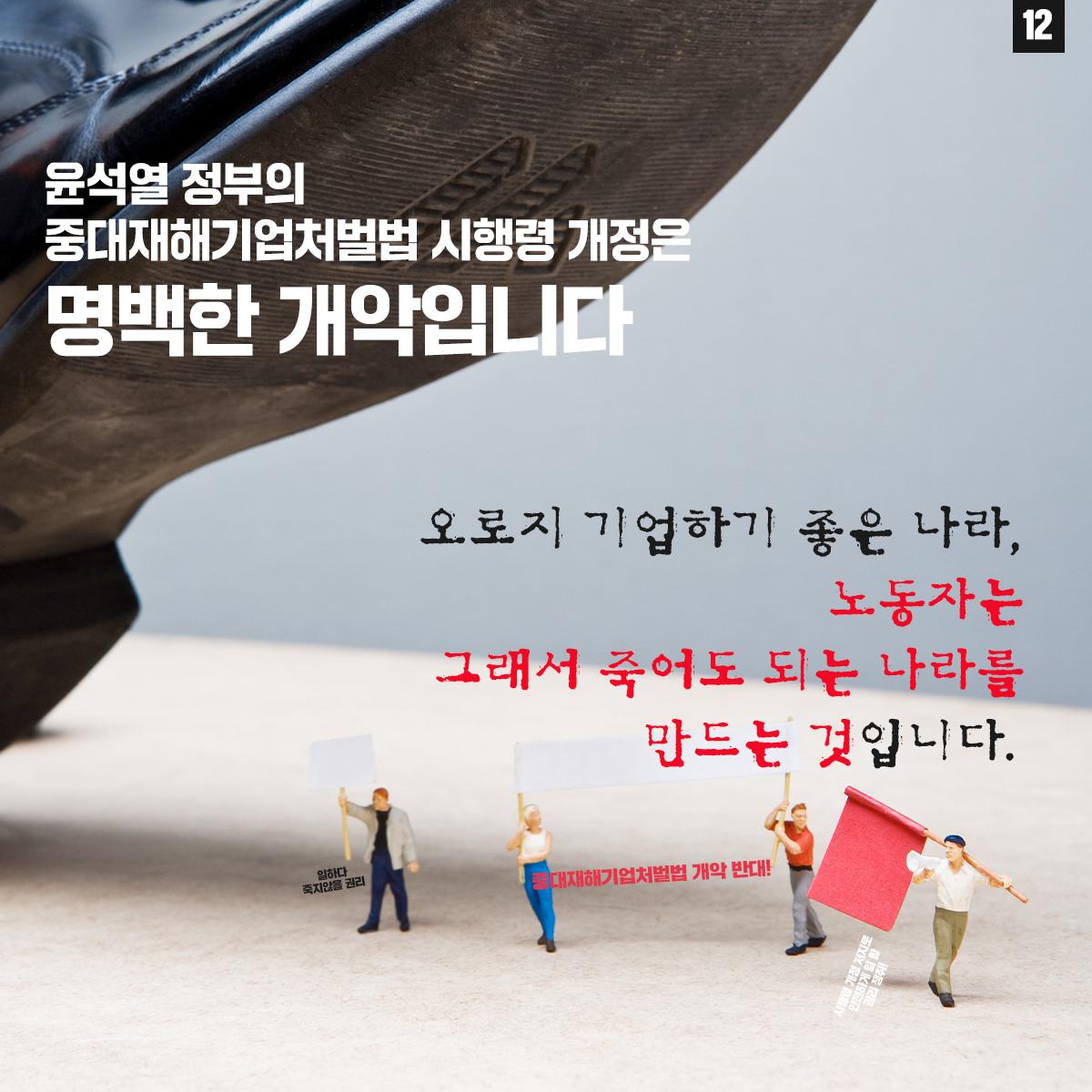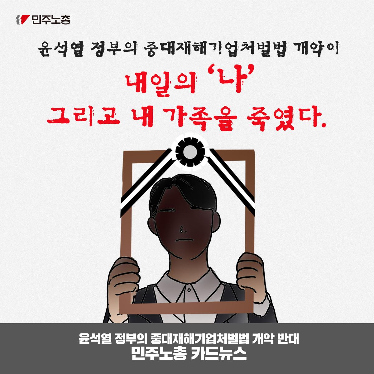 민주노총은 윤석열 정부의 중대재해기업처벌법 개악에 반대하며 관련 웹자보를 제작했다. 자료는 법 제정 과정과 해외 사례를 설명하고 경영계의 개정 요구를 비판한다. 시행령 개악 추진이 노동자 안전을 위협할 수 있음을 경고하며, 하청 및 특수고용노동자 중대재해 예방 의무 삭제와 안전보건 비용 삭감 등 개악 내용을 지적한다. 산업재해 사망자 수치를 제시하며 산업안전 강화를 촉구한다.