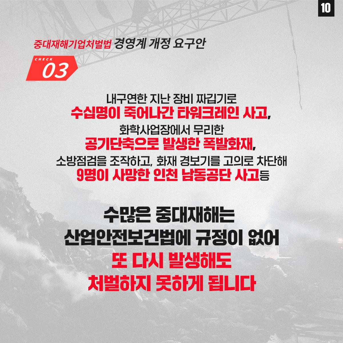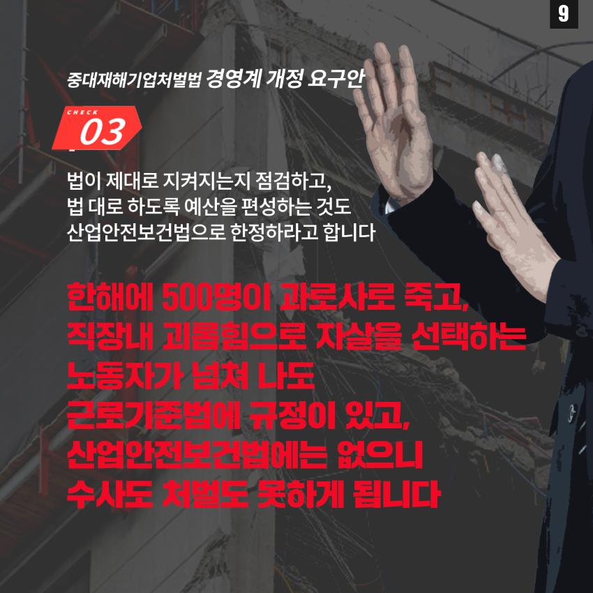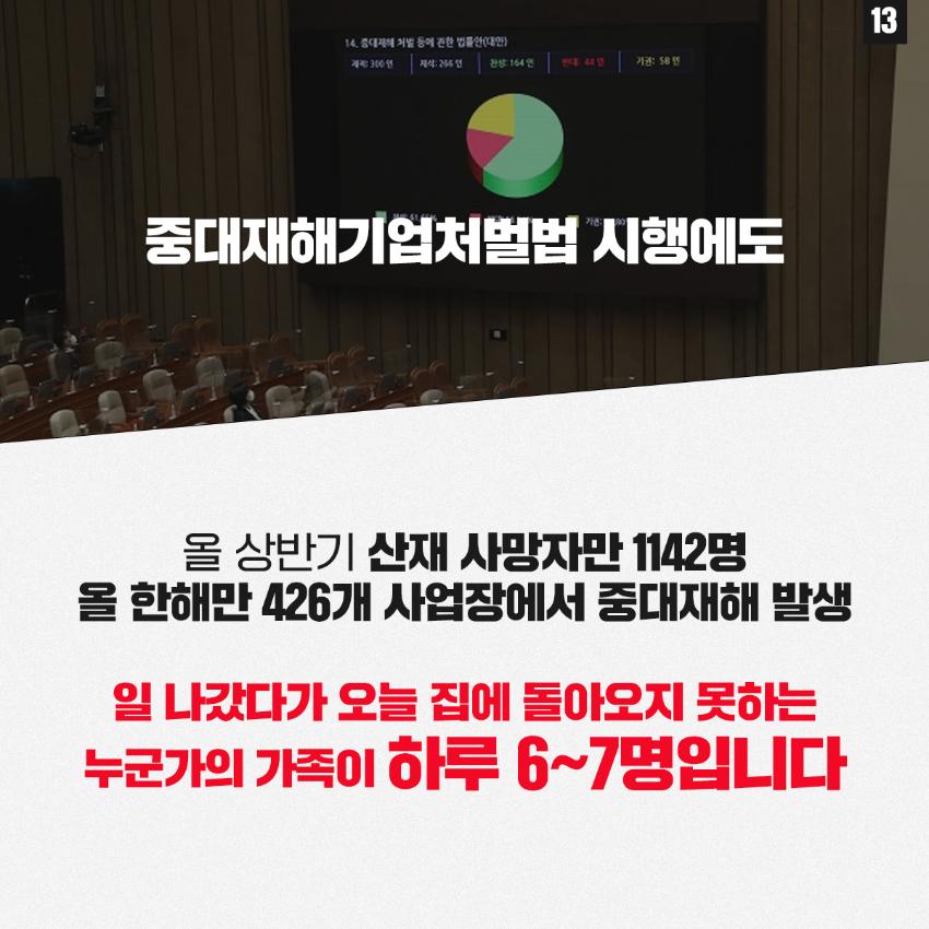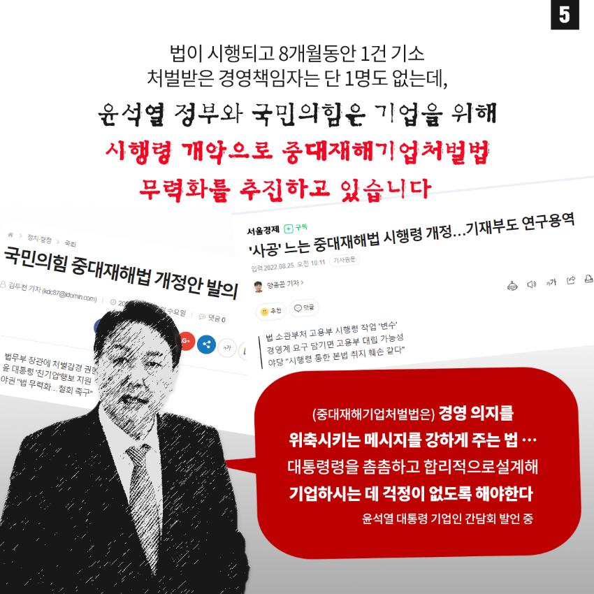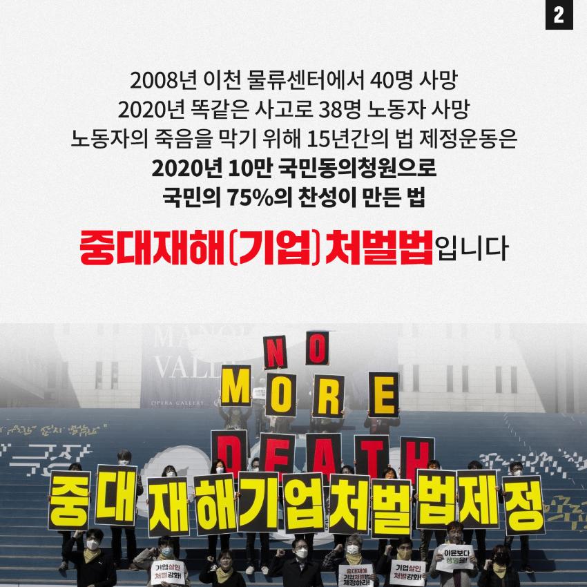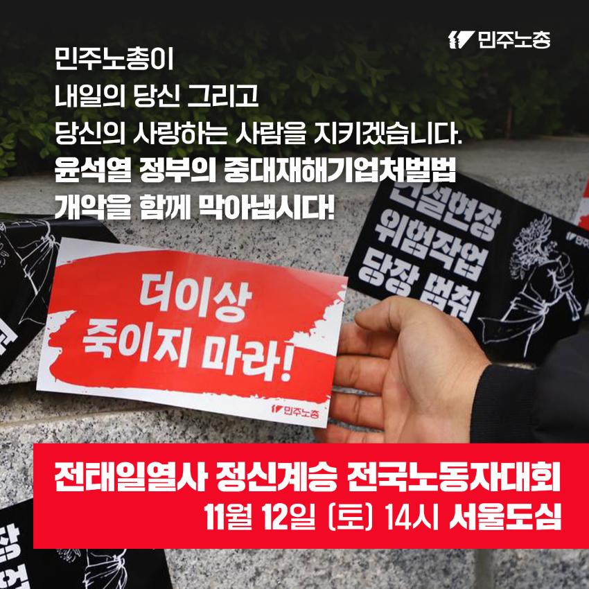 민주노총은 윤석열 정부의 중대재해기업처벌법 개악에 반대하며 관련 웹자보를 제작했다. 자료는 법 제정 과정과 해외 사례를 설명하고 경영계의 개정 요구를 비판한다. 시행령 개악 추진이 노동자 안전을 위협할 수 있음을 경고하며, 하청 및 특수고용노동자 중대재해 예방 의무 삭제와 안전보건 비용 삭감 등 개악 내용을 지적한다. 산업재해 사망자 수치를 제시하며 산업안전 강화를 촉구한다.