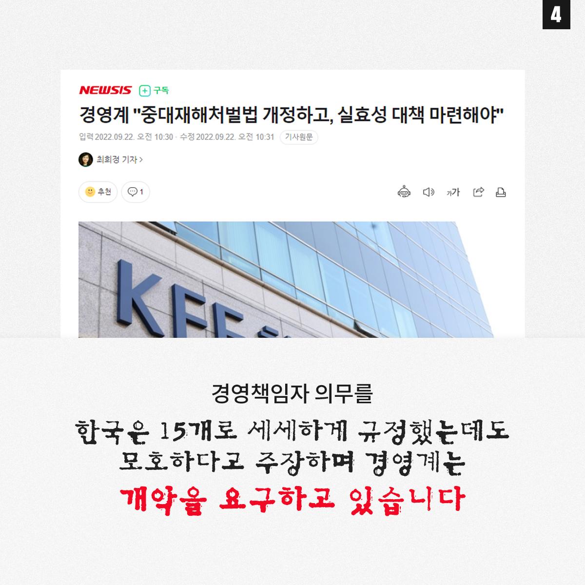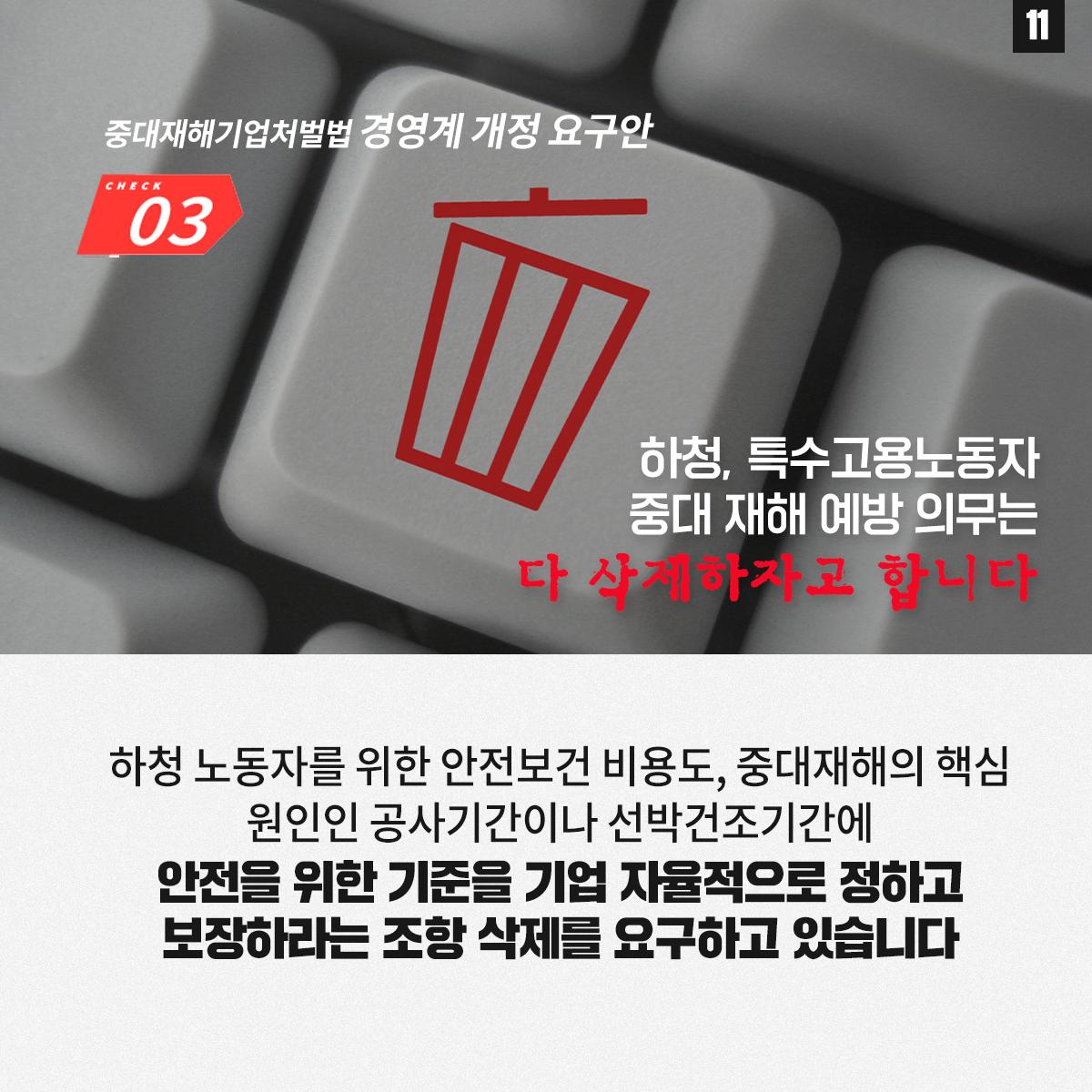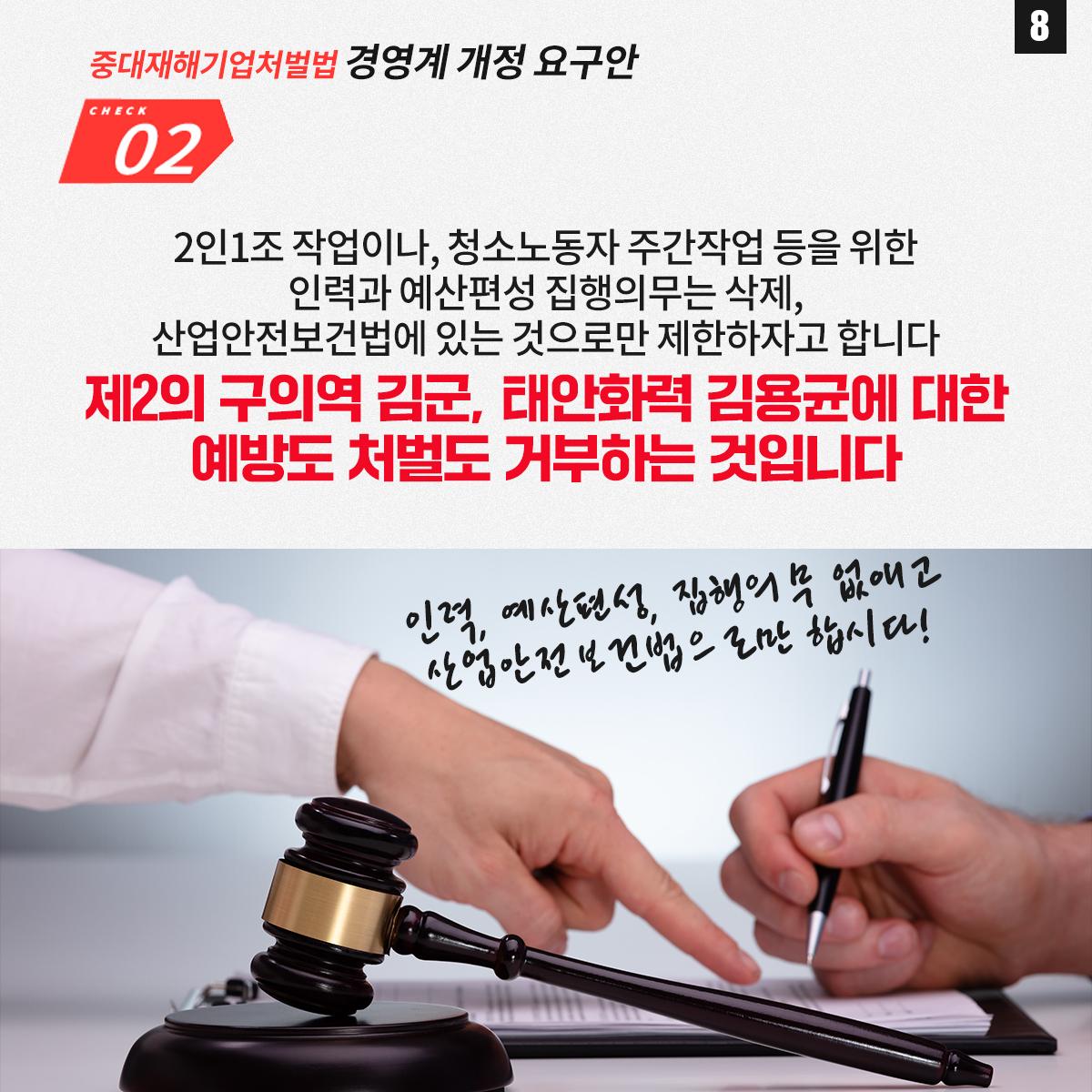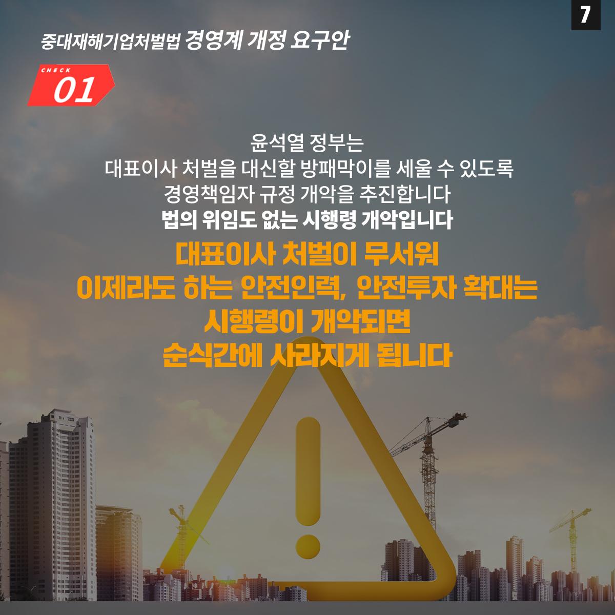 민주노총은 윤석열 정부의 중대재해기업처벌법 개악에 반대하며 관련 웹자보를 제작했다. 자료는 법 제정 과정과 해외 사례를 설명하고 경영계의 개정 요구를 비판한다. 시행령 개악 추진이 노동자 안전을 위협할 수 있음을 경고하며, 하청 및 특수고용노동자 중대재해 예방 의무 삭제와 안전보건 비용 삭감 등 개악 내용을 지적한다. 산업재해 사망자 수치를 제시하며 산업안전 강화를 촉구한다.
