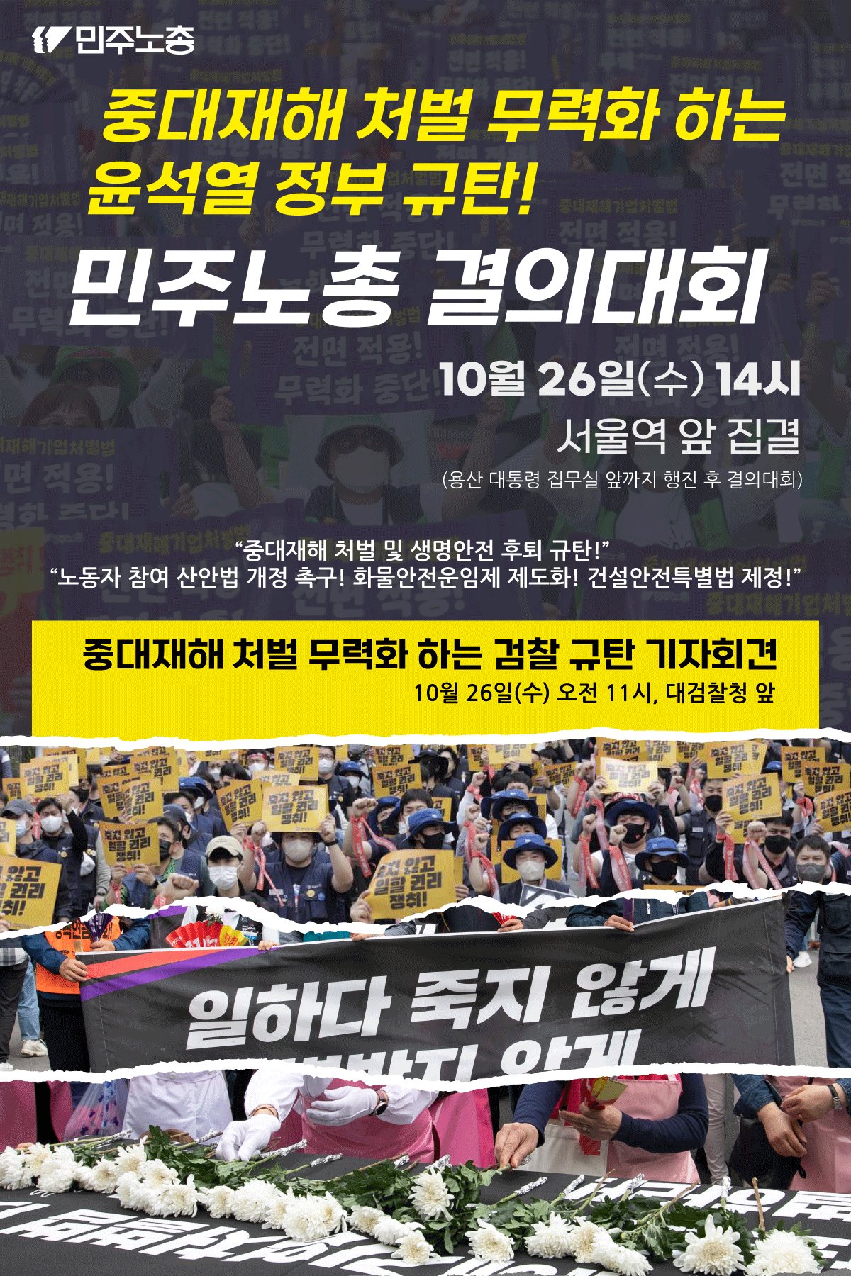 민주노총은 윤석열 정부의 중대재해 처벌 무력화 시도에 반발하며 규탄 대회를 개최한다. 10월 26일 오후 2시 서울역 앞에서 결의대회를 열고 용산 대통령 집무실까지 행진할 예정이다. 같은 날 오전 11시에는 대검찰청 앞에서 검찰 규탄 기자회견을 진행한다. 노동자들은 중대재해 처벌 및 생명안전 후퇴를 규탄하며 노동자 참여 산안법 개정 촉구, 화물안전운임제 제도화, 건설안전특별법 제정을 요구한다.