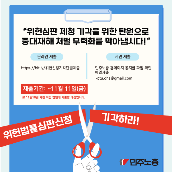 해당 웹자보는 위헌심판 제청 기각을 위한 탄원 동참을 호소한다. 온라인 또는 서면으로 탄원서를 제출할 수 있으며, 제출 기한은 11월 11일이다. 민주노총은 중대재해 처벌 무력화를 막기 위해 탄원 운동을 전개한다. 11월 16일 재판 이전 법원에 제출할 예정이다.