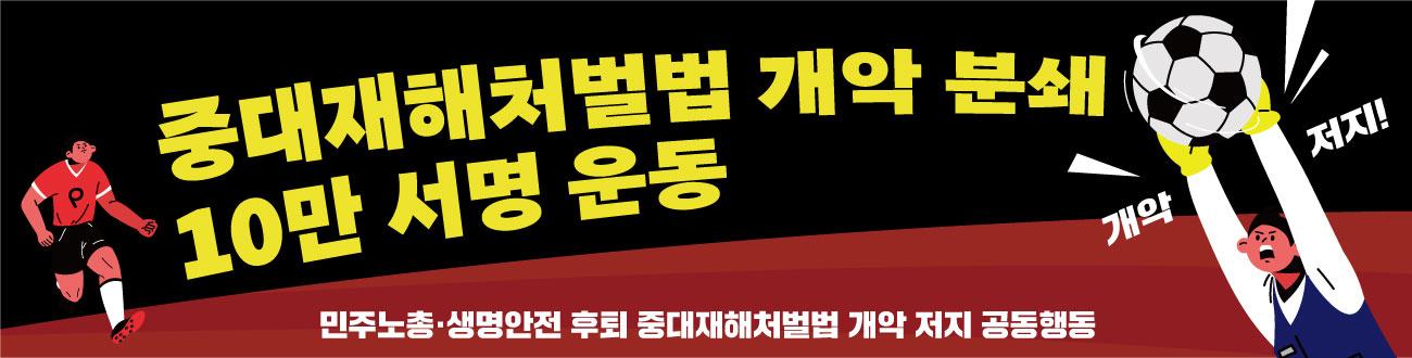 본 웹자보는 중대재해처벌법 개악을 저지하기 위한 10만 서명 운동을 알리고 있다. 축구 경기 상황을 묘사하여 법 개정을 막기 위한 적극적인 행동을 촉구한다. 민주노총은 생명 안전 후퇴를 막고 중대재해처벌법을 지키기 위한 공동행동을 전개한다. 웹자보는 법 개악 저지를 위한 서명 운동 참여를 독려하는 내용을 담고 있다.
