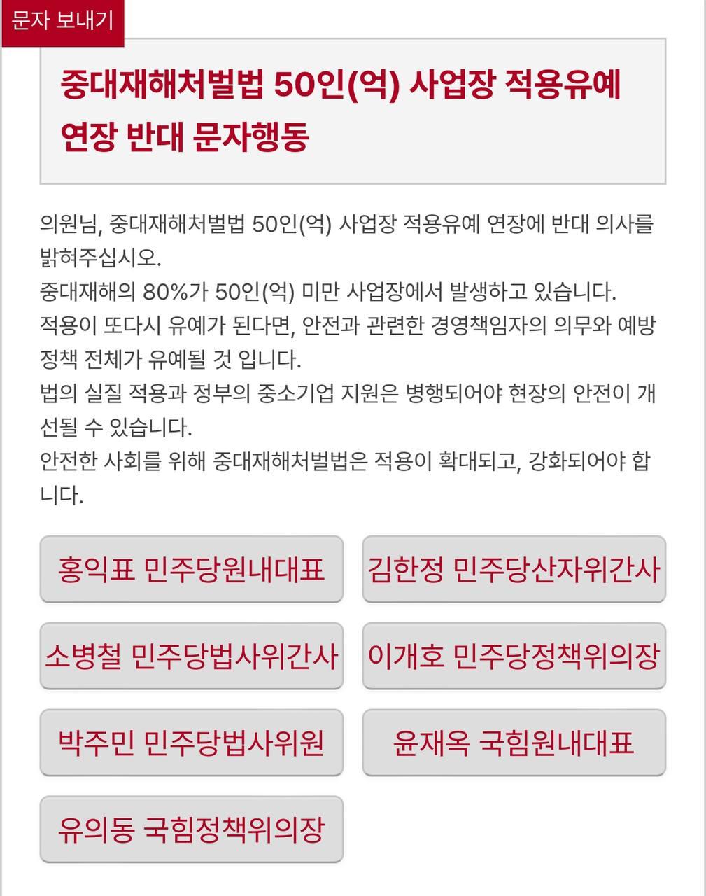 중대재해처벌법 50인(억) 사업장 적용유예 연장에 반대하는 문자 행동을 독려하는 내용이다. 의원들에게 중대재해처벌법 50인(억) 사업장 적용유예 연장에 반대 의사를 밝혀달라고 요청하고 있다. 중대재해의 80%가 50인(억) 미만 사업장에서 발생하고 있으며, 적용이 유예될 경우 안전 관련 경영책임자의 의무와 예방 정책 전체가 유예될 것이라고 주장한다. 법의 실질 적용과 정부의 중소기업 지원이 병행되어야 현장의 안전이 개선될 수 있다고 강조한다. 안전한 사회를 위해 중대재해처벌법 적용이 확대되고 강화되어야 한다고 주장한다.