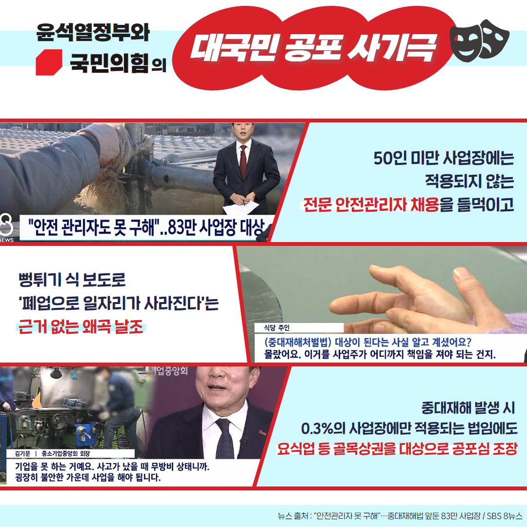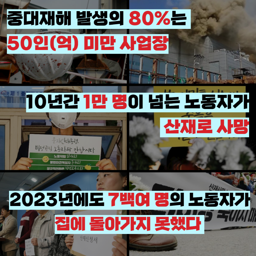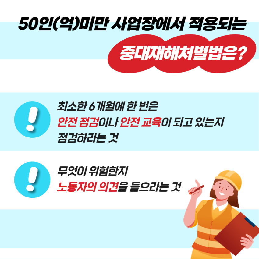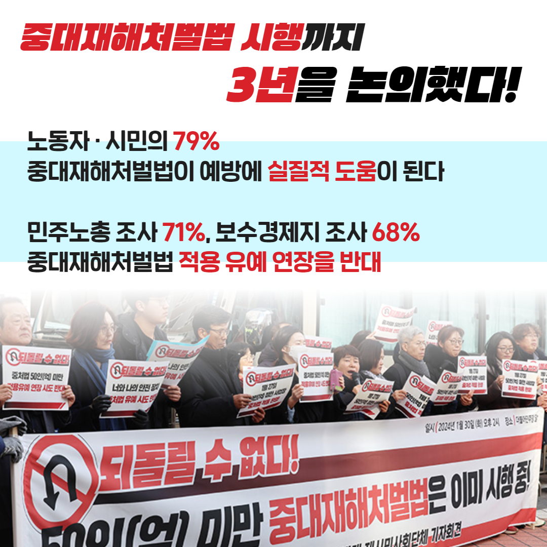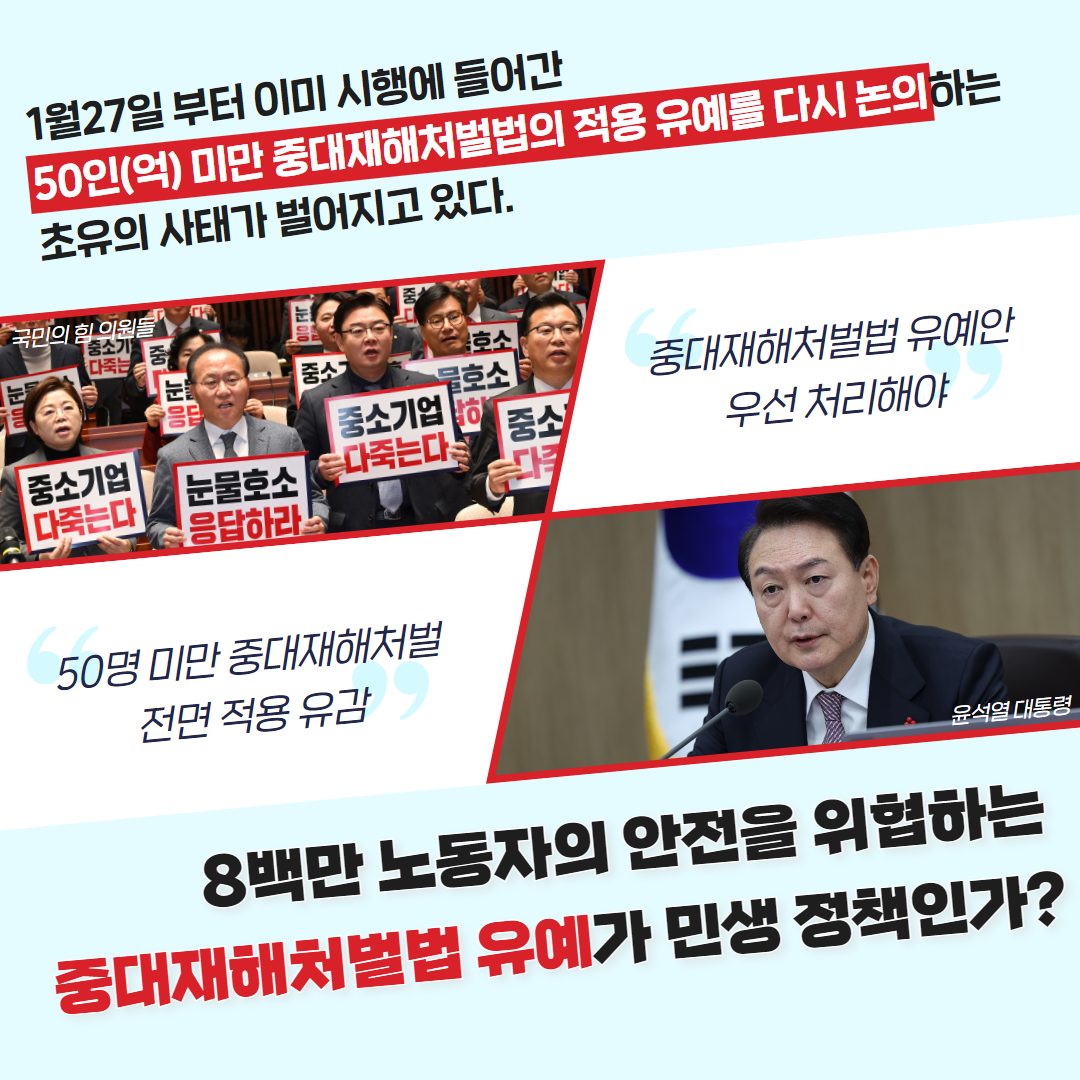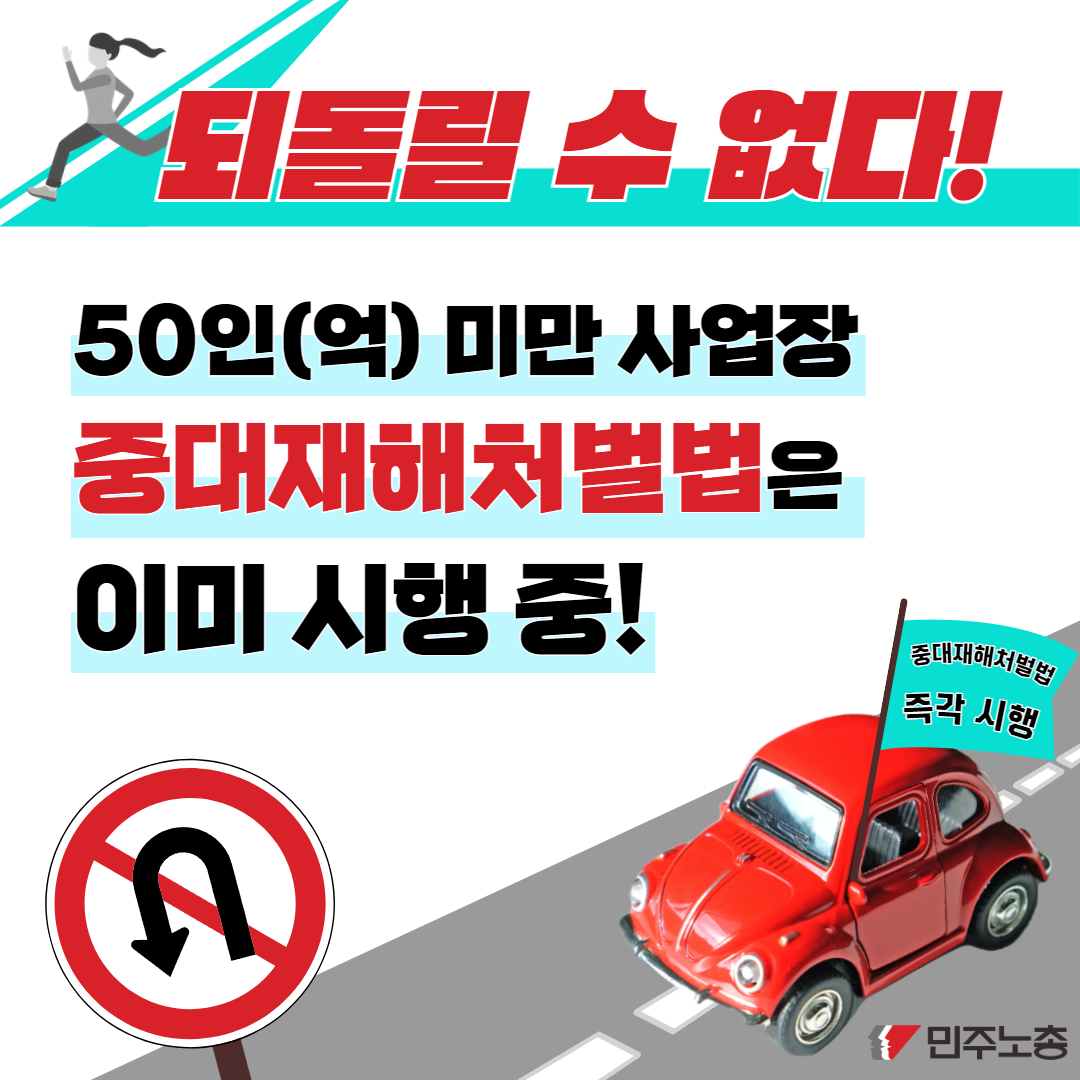 민주노총에서 제작한 50인 미만 사업장 중대재해처벌법 시행 관련 웹자보 자료이다. 법 시행의 필요성을 강조하며, 관련 오해를 해명하고 유예 주장을 비판한다. 안전관리자 채용 의무, 안전보건 관리 체계 구축 부담 등에 대한 사업장의 우려를 다룬다. 정부의 엄정한 법 집행과 지원 대책 강화를 요구하는 내용도 포함되어 있다.