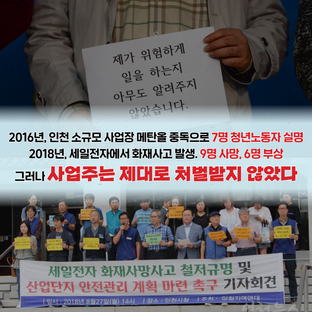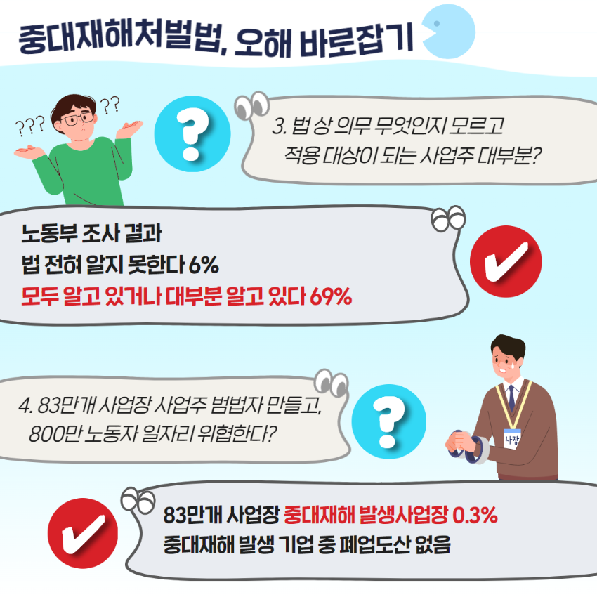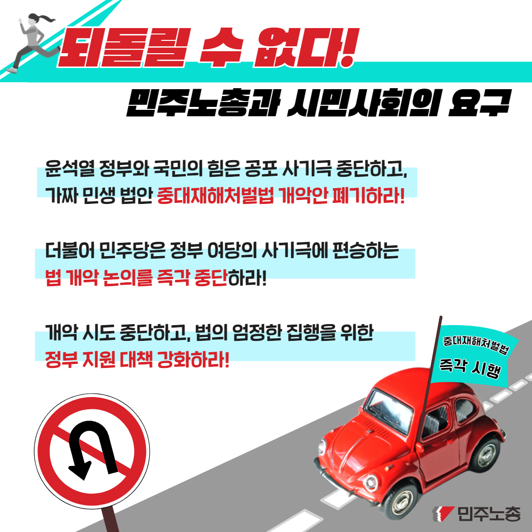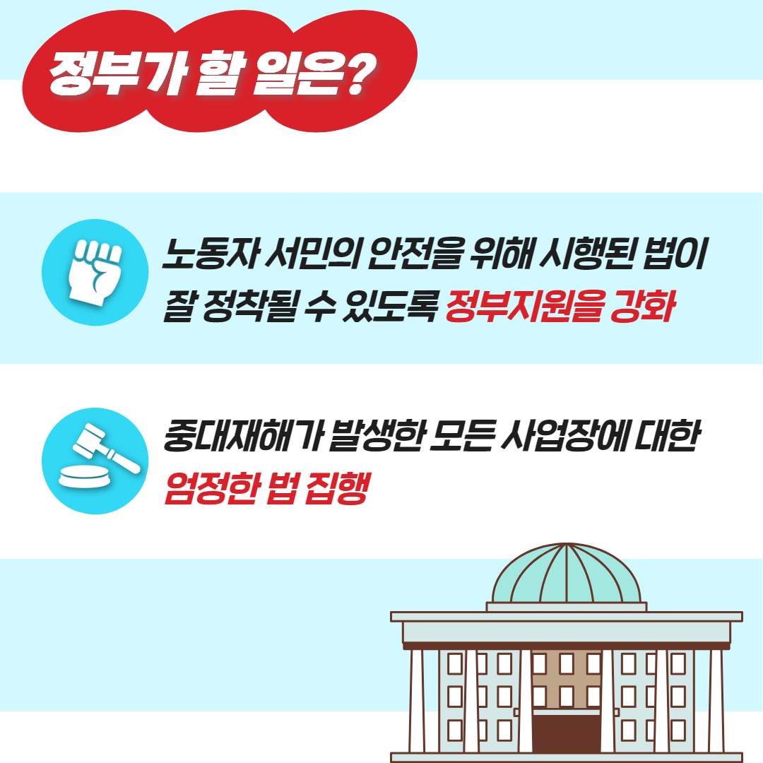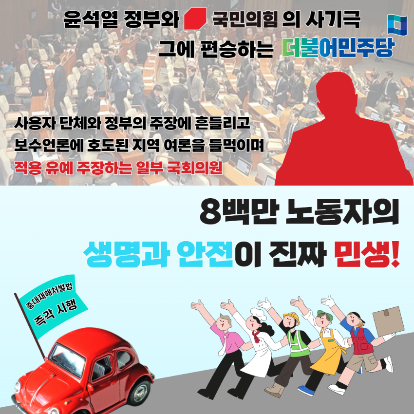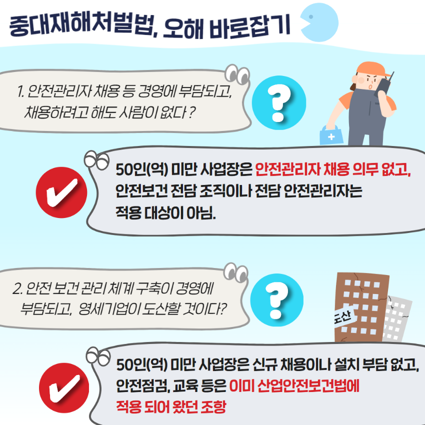 민주노총에서 제작한 50인 미만 사업장 중대재해처벌법 시행 관련 웹자보 자료이다. 법 시행의 필요성을 강조하며, 관련 오해를 해명하고 유예 주장을 비판한다. 안전관리자 채용 의무, 안전보건 관리 체계 구축 부담 등에 대한 사업장의 우려를 다룬다. 정부의 엄정한 법 집행과 지원 대책 강화를 요구하는 내용도 포함되어 있다.