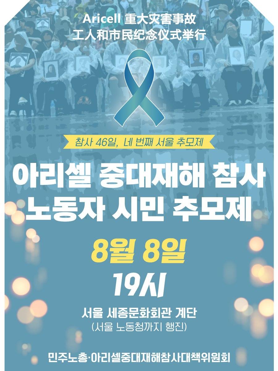 해당 이미지는 아리셀 중대재해 참사 노동자 시민 추모제를 알리는 웹자보이다. 추모제는 8월 8일 19시에 서울 세종문화회관 계단에서 시작하여 서울 노동청까지 행진하는 일정으로 진행된다. 해당 추모제는 참사 46일, 네 번째 서울 추모제로서 개최된다. 웹자보는 아리셀 중대재해 참사 희생자들을 기리고, 노동자 시민들의 참여를 독려하기 위해 제작되었다.