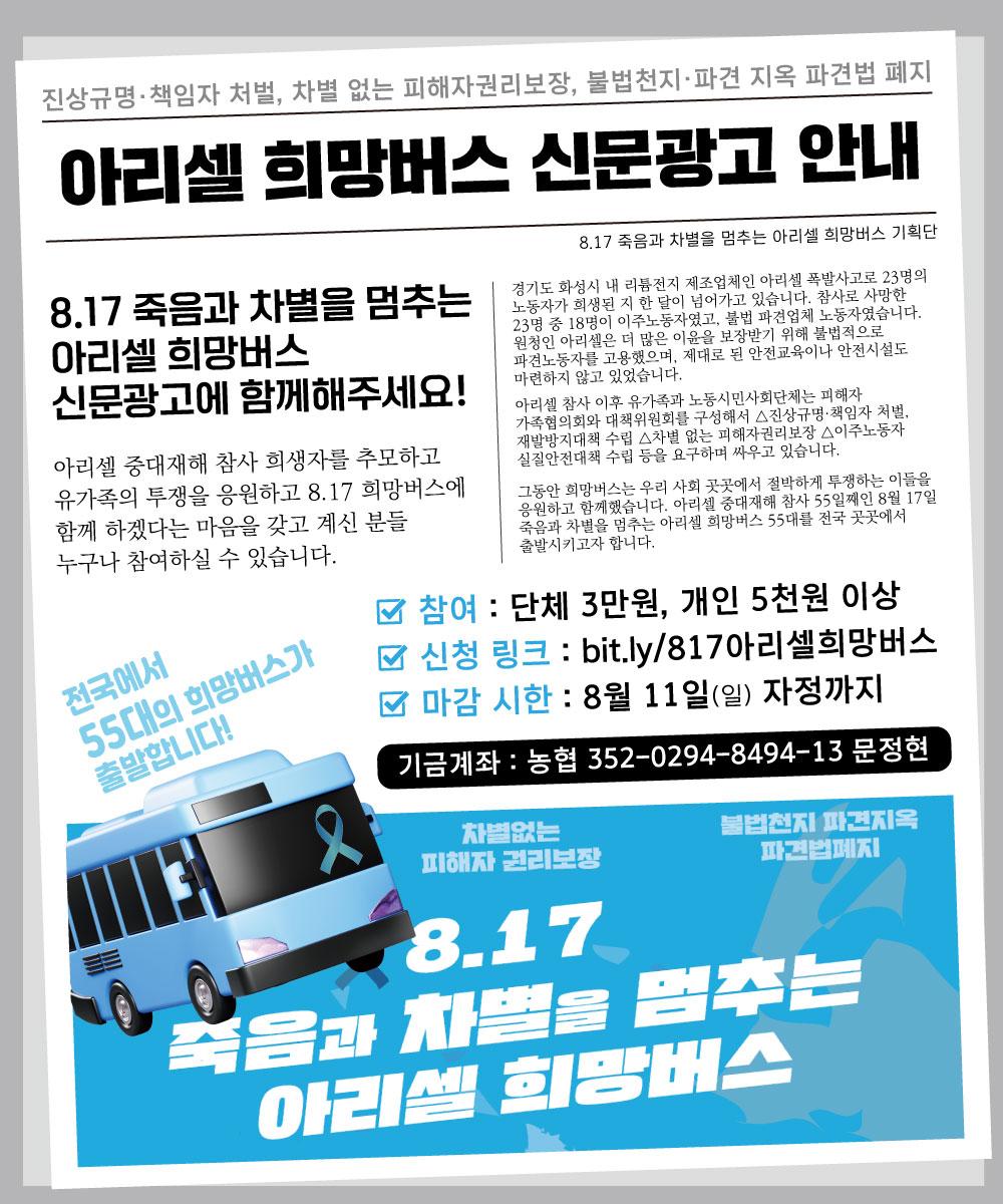 본 웹자보는 아리셀 화재 참사 희생자를 추모하고 유가족의 투쟁을 지지하기 위한 희망버스 신문광고 참여를 독려한다. 아리셀은 불법 파견 노동자를 고용하고 안전 교육 및 시설을 제대로 갖추지 않아 사고를 야기했다. 유가족과 노동시민사회단체는 진상규명, 책임자 처벌, 재발 방지 대책 수립, 차별 없는 피해자 권리 보장 등을 요구하며 투쟁하고 있다. 희망버스는 8월 17일, 아리셀 참사 55일째 되는 날 전국 55대 규모로 출발할 예정이다.