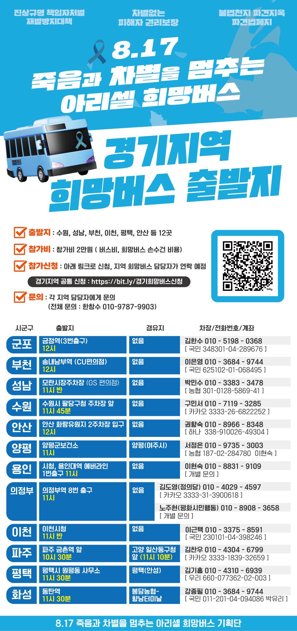 8월 17일 죽음과 차별을 멈추는 아리셀 희망버스 경기지역 출발지를 안내하는 웹자보이다. 수원, 성남, 부천, 이천, 평택, 안산 등 12곳에서 출발하며 참가비는 2만원이다. 각 지역별 출발 장소와 시간, 연락처 정보가 담겨 있다. 경기지역 공통 신청 링크와 문의 연락처도 기재되어 있다.