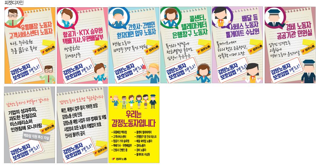 감정노동자 보호입법 쟁취를 위한 웹자보 디자인 시안이다. 유통매장, 고객센터, 항공, 택배, 간호, 콜센터, 배달, 경비 등 다양한 직종의 감정노동자들이 겪는 어려움을 시각적으로 표현했다. 폭언, 성희롱, 과도한 친절 요구, 인격 모독 등 감정노동으로 인한 문제점을 지적하고, 감정노동자 보호법의 필요성을 강조한다. 감정노동 산재 인정, 폭언·폭행 시 업무 거부권 보장, 사업주 의무 법제화 및 차별 금지 등을 요구하고 있다.