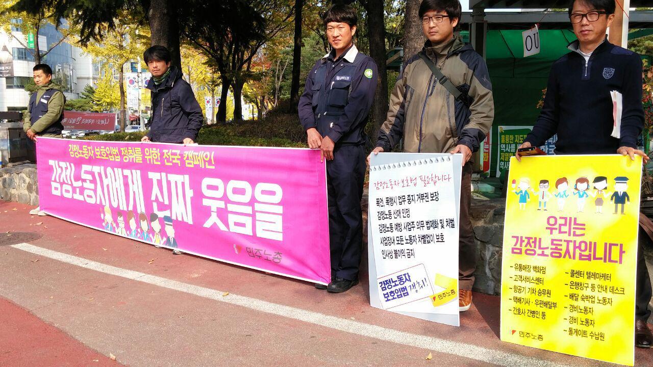 사진은 감정노동자 보호입법 쟁취를 위한 캠페인 현장을 담고 있다. 참가자들은 '감정노동자에게 진짜 웃음을'이라는 문구가 적힌 현수막과 피켓을 들고 있다. 피켓에는 유통매장, 콜센터, 은행, 항공, 택배, 간호, 경비, 톨게이트 등 다양한 직종의 감정노동자들이 언급되어 있다. 민주노총은 감정노동자 보호를 위한 법제화를 요구하고 있다.