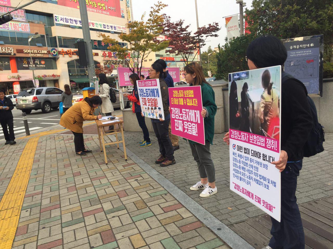 사진은 감정노동자 보호입법 쟁취를 위한 시위 현장을 담고 있다. 시위 참가자들은 관련 문구가 적힌 피켓을 들고 있으며, 한 시민은 테이블에 서류를 작성하고 있다. 배경에는 관련 문구가 적힌 현수막과 건물이 보인다. 시위는 감정노동자 보호를 위한 법 제정을 촉구하는 목적으로 보인다.