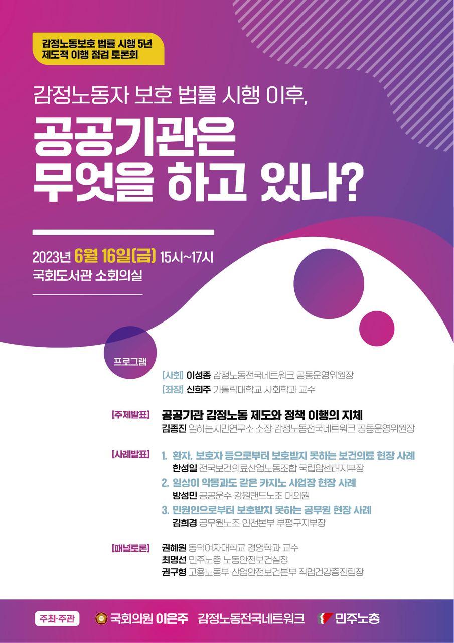 감정노동자 보호 법률 시행 5년을 맞아 제도적 이행을 점검하는 토론회가 개최된다. 토론회에서는 공공기관의 감정노동 제도와 정책 이행 실태를 살펴보고, 환자, 보호자, 민원인 등으로부터 보호받지 못하는 현장 사례를 공유한다. 또한, 카지노 사업장과 공무원 현장의 어려움도 논의될 예정이다. 토론회는 국회의원 이은주, 감정노동전국네트워크, 민주노총이 공동 주최한다.