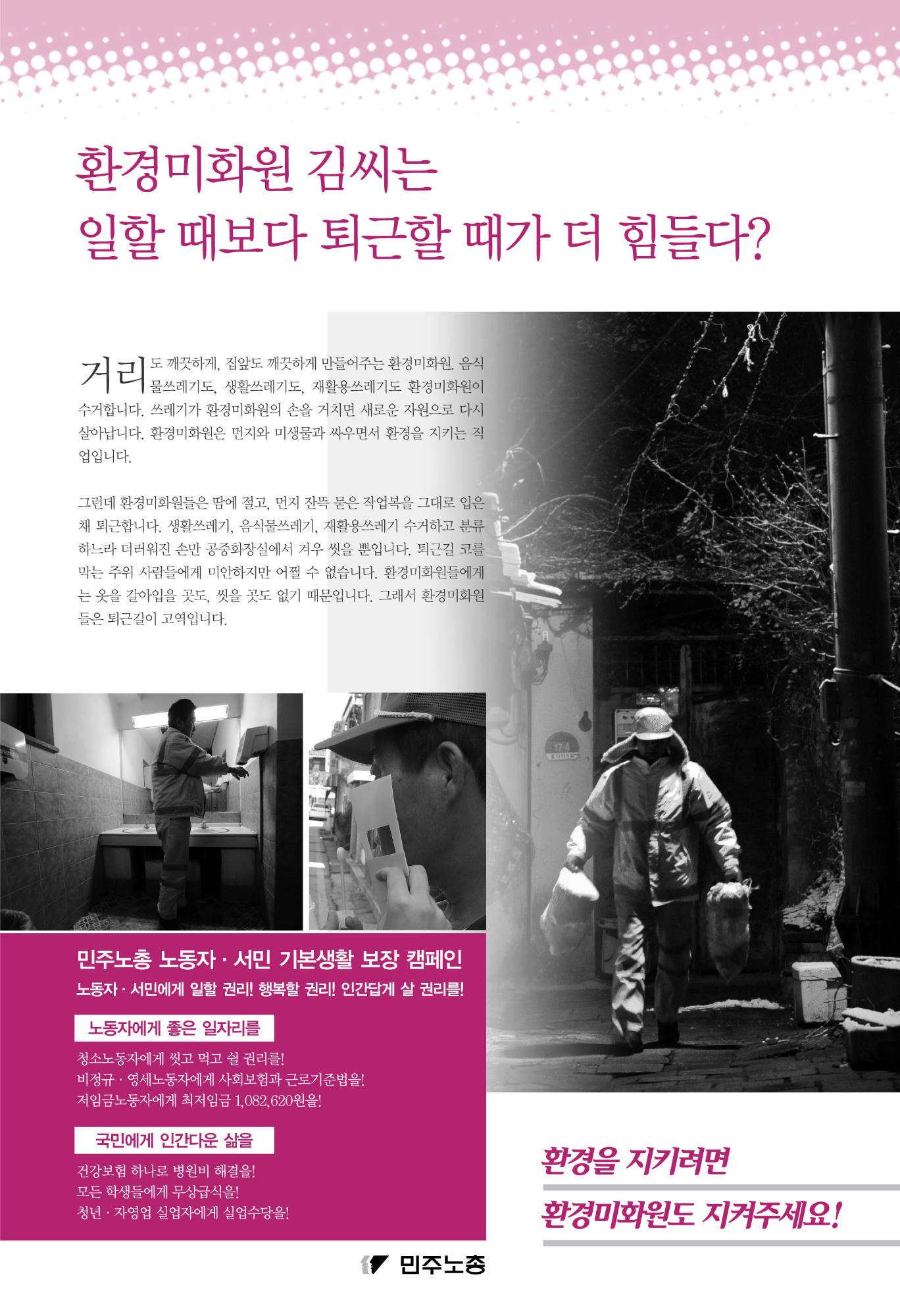 본 웹자보는 환경미화원 김씨의 고충을 담고 있다. 환경미화원은 거리의 청결을 유지하고 쓰레기를 자원화하는 중요한 역할을 수행하지만, 작업복을 갈아입거나 씻을 공간이 없어 퇴근길에 어려움을 겪는다. 민주노총은 청소노동자에게 씻고 쉴 권리를 보장하고, 비정규직 및 영세노동자에게 사회보험과 근로기준법을 적용하며, 저임금노동자에게 최저임금을 보장할 것을 주장한다. 또한, 국민에게는 건강보험을 통한 병원비 해결, 학생 무상급식, 청년 및 자영업자 실업수당 지급 등을 요구한다.