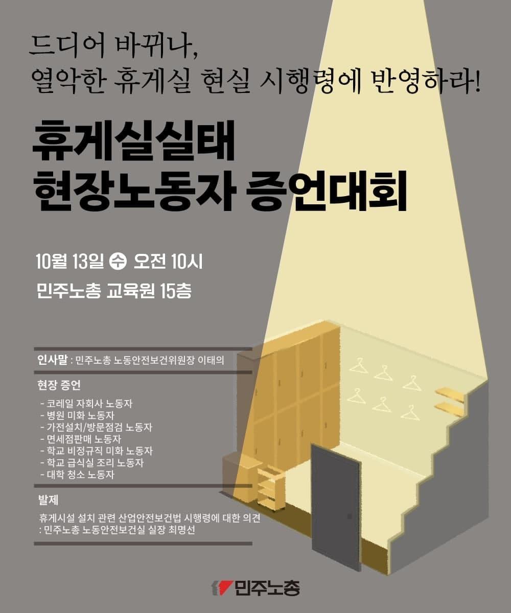 민주노총에서 열악한 휴게실 현실을 개선하기 위해 현장 노동자 증언대회를 개최한다. 코레일 자회사 노동자, 병원 미화 노동자, 가전설치/방문점검 노동자, 면세점 판매 노동자, 학교 비정규직 미화 노동자, 학교 급식실 조리 노동자, 대학 청소 노동자 등이 참여하여 휴게실 실태를 증언할 예정이다. 휴게시설 설치 관련 산업안전보건법 시행령에 대한 의견도 발표된다. 대회는 10월 13일 오전 10시 민주노총 교육원 15층에서 진행된다.