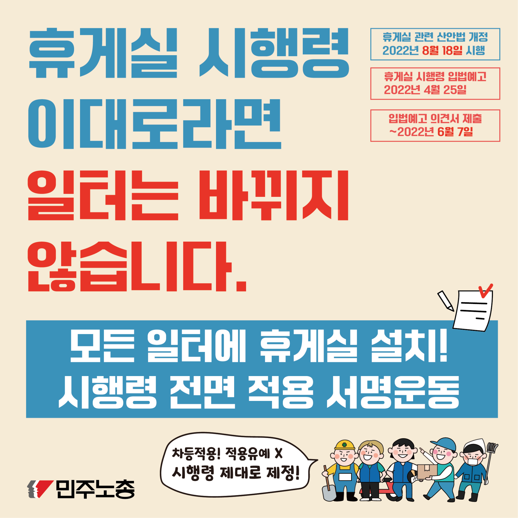 본 웹자보는 휴게실 관련 산업안전보건법 개정 시행에도 불구하고 노동 현장의 변화가 미미함을 지적한다. 휴게실 시행령이 차등 적용되거나 적용 유예되는 상황을 비판하며, 모든 일터에 휴게실 설치를 요구하는 서명운동을 전개한다. 노동자들은 시행령이 제대로 제정되어 현장에 적용되기를 희망한다. 민주노총은 노동자들의 휴식권 보장을 위해 지속적으로 노력할 것임을 밝힌다.