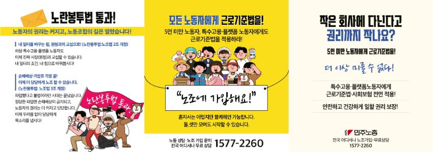 웹자보는 노란봉투법 통과를 기념하며 모든 노동자에게 근로기준법 적용을 촉구한다. 5인 미만 사업장, 특수고용 및 플랫폼 노동자에게도 근로기준법이 적용되어야 함을 강조한다. 손해배상 및 가압류 걱정 없이 노조 활동을 보장하고, 원청과의 교섭을 통해 노동 조건을 개선할 수 있도록 한다. 특수고용 및 플랫폼 노동자에게도 근로기준법과 사회보험을 전면 적용하여 안전하고 건강하게 일할 권리를 보장해야 한다고 주장한다.