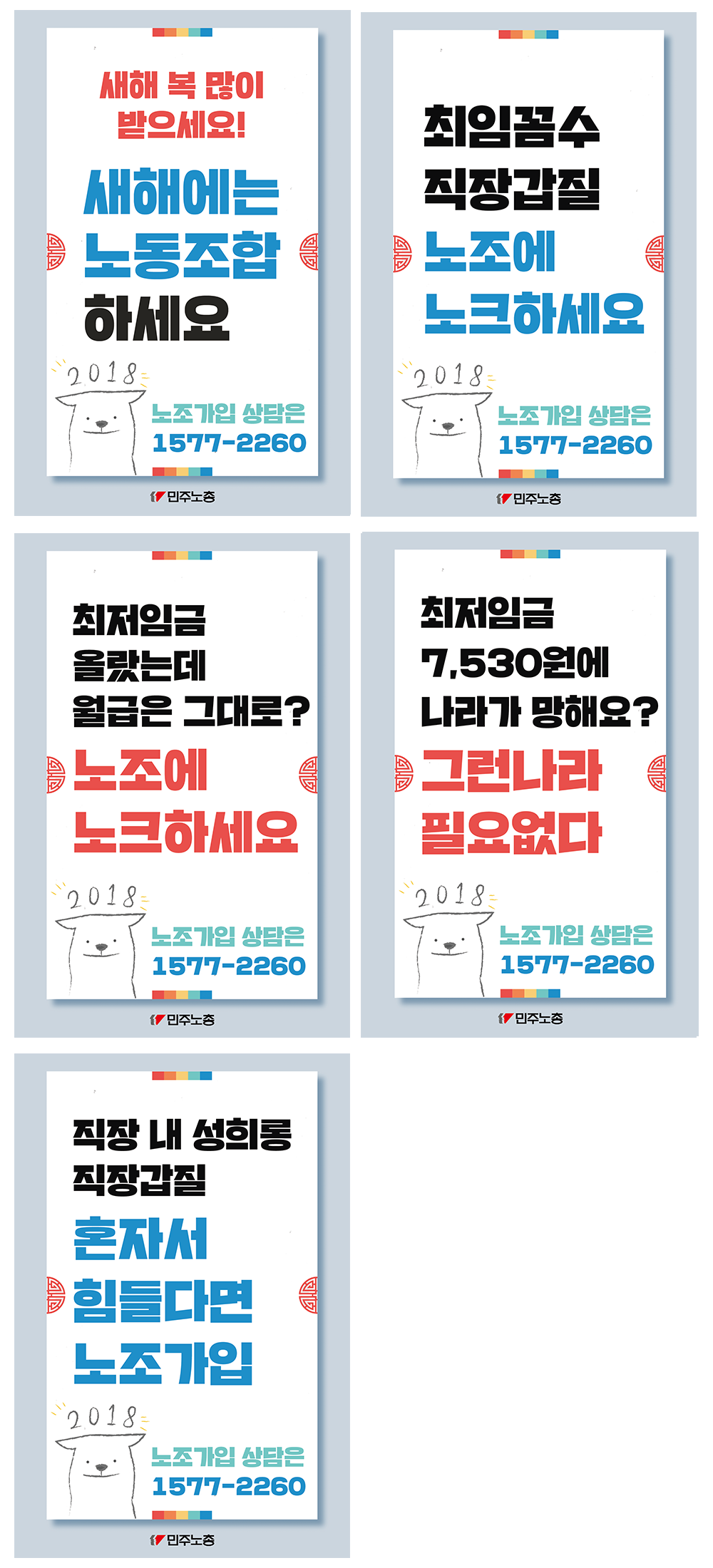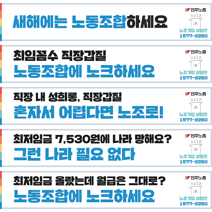 민주노총에서 제작한 웹자보 이미지 자료이다. 새해를 맞아 노동조합 가입을 독려하는 내용을 담고 있다. 최저임금, 직장 내 성희롱 및 갑질 문제에 대한 해결책으로 노동조합 가입을 제시한다. 노동조합 가입 상담 전화번호를 안내하고 있다.