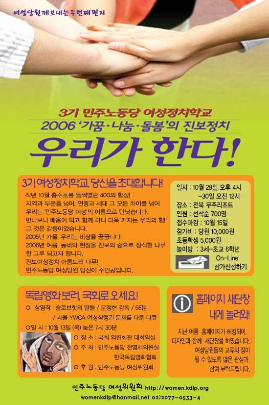 민주노동당 여성위원회에서 2006년에 개최하는 '가꿈·나눔·돌봄'의 진보정치를 주제로 한 3기 여성정치학교를 홍보하는 웹자보이다. 10월 29일부터 30일까지 전북 무주리조트에서 진행되며, 참가비는 당원 10,000원, 초등학생 5,000원이다. 독립영화 상영회와 홈페이지 새단장 소식도 함께 알리고 있다. 여성당원들의 참여를 독려하고 있다.