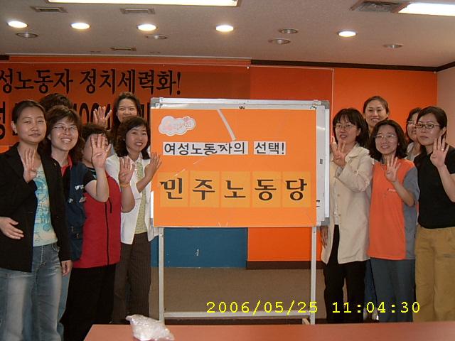 사진은 민주노동당 지지자들의 모습으로 보인다. 여성들이 피켓을 들고 손가락으로 숫자를 표현하며 포즈를 취하고 있다. 피켓에는 '여성노동자의 선택! 민주노동당'이라는 문구가 적혀 있다. 사진 하단에는 촬영 날짜와 시간이 표시되어 있다.