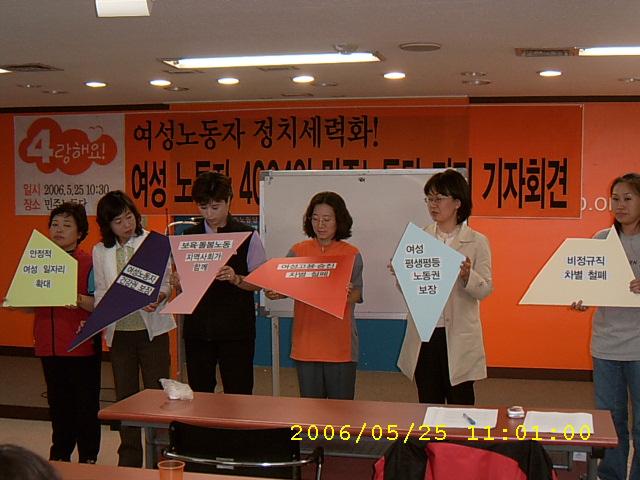 사진은 여성노동자 정치세력화를 위한 기자회견 장면을 담고 있다. 참가자들은 각각 안정적인 여성 일자리 확대, 여성노동자 건강권 보장, 보육돌봄노동 지역사회 함께, 여성 평생평등 노동권 보장, 비정규직 차별 철폐 등의 요구가 적힌 피켓을 들고 있다. 이는 여성 노동자들이 직면한 다양한 문제점을 해결하고 권익을 보호하기 위한 활동의 일환이다. 사진을 통해 여성 노동자들의 정치적 참여와 권리 주장을 위한 노력을 엿볼 수 있다.