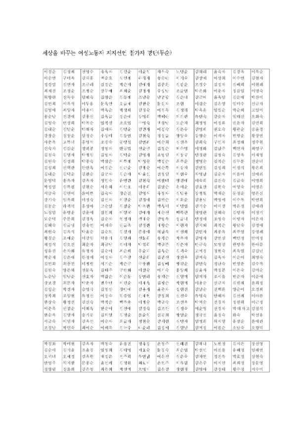 본 문서는 '세상을 바꾸는 여성노동자'를 지지하는 선언에 참여한 사람들의 명단을 담고 있다. 명단은 무순으로 나열되어 있으며, 다양한 분야의 사람들이 참여했음을 알 수 있다. 지지 선언은 여성 노동자들의 권익 향상과 사회적 변화를 지지하는 의미를 담고 있다. 명단은 이러한 운동에 참여한 사람들의 연대를 보여주는 자료이다.