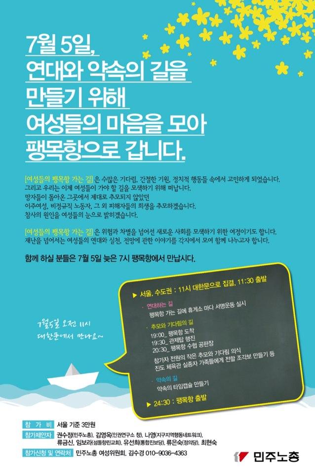 민주노총 여성위원회에서 주최하는 팽목항 방문 행사 웹자보이다. 7월 5일, 여성들의 마음을 모아 팽목항으로 가서 세월호 참사 희생자들을 추모하고 연대하는 시간을 갖는다. 이주여성, 비정규직 노동자 등 사회적 약자들의 희생을 기리고, 참사의 원인을 여성의 시각으로 밝히고자 한다. 참가자들은 팽목항에서 추모 행사, 타임캡슐 만들기 등의 활동에 참여한다.