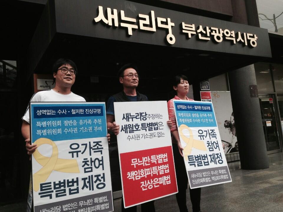 사진은 새누리당 부산광역시당 앞에서 세월호 특별법 제정을 요구하는 시위 장면을 담고 있다. 시위 참가자들은 '유가족 참여 특별법 제정' 등의 문구가 적힌 피켓을 들고 있다. 피켓에는 특별위원회의 절반을 유가족 추천으로 구성하고, 특별위원회에 수사권과 기소권을 부여해야 한다는 내용이 담겨 있다. 또한 새누리당의 특별법안은 무늬만 특별법이며, 진상 은폐 및 책임 회피를 위한 것이라는 비판적인 내용도 포함되어 있다.