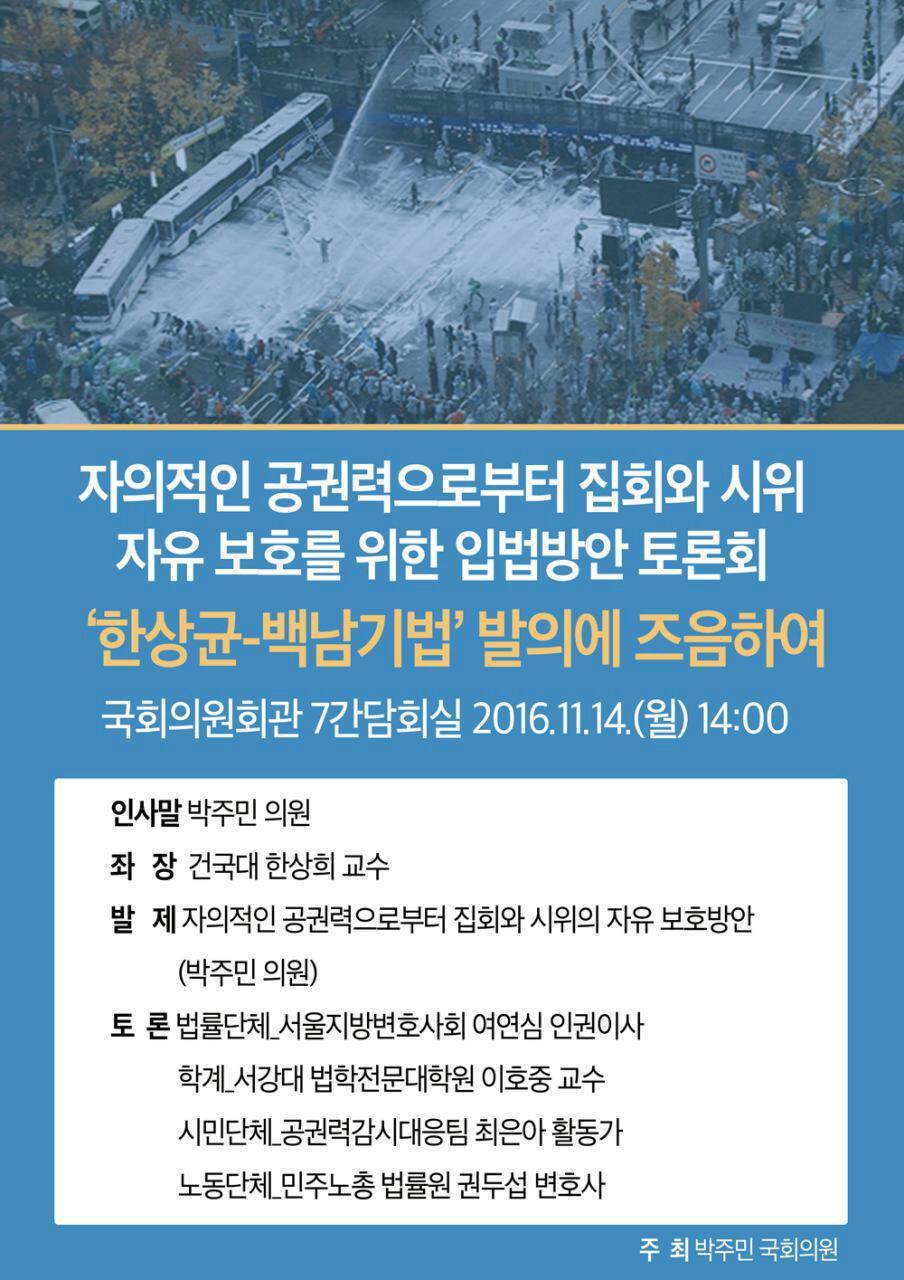 본 웹자보는 자의적인 공권력으로부터 집회와 시위의 자유를 보호하기 위한 입법 방안 토론회를 알리고 있다. 토론회는 '한상균-백남기법' 발의에 즈음하여 국회의원회관에서 개최된다. 박주민 의원의 인사말을 시작으로 건국대 한상희 교수가 좌장을 맡고, 박주민 의원이 발제를 한다. 토론에는 법률단체, 학계, 시민단체, 노동단체 관계자들이 참여한다.