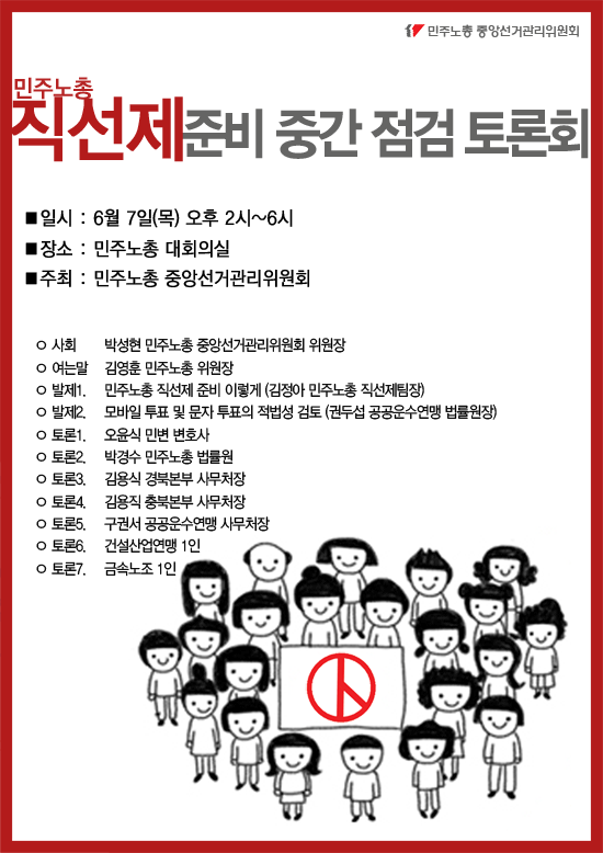 민주노총 중앙선거관리위원회에서 직선제 준비 중간 점검 토론회를 개최한다. 토론회는 6월 7일 오후 2시부터 6시까지 민주노총 대회의실에서 진행된다. 토론회에서는 모바일 투표 및 문자 투표의 적법성 검토 등 직선제 준비 과정에 대한 논의가 이루어질 예정이다. 박성현 민주노총 중앙선거관리위원회 위원장이 사회를 맡고, 김영훈 민주노총 위원장이 여는 말을 한다.