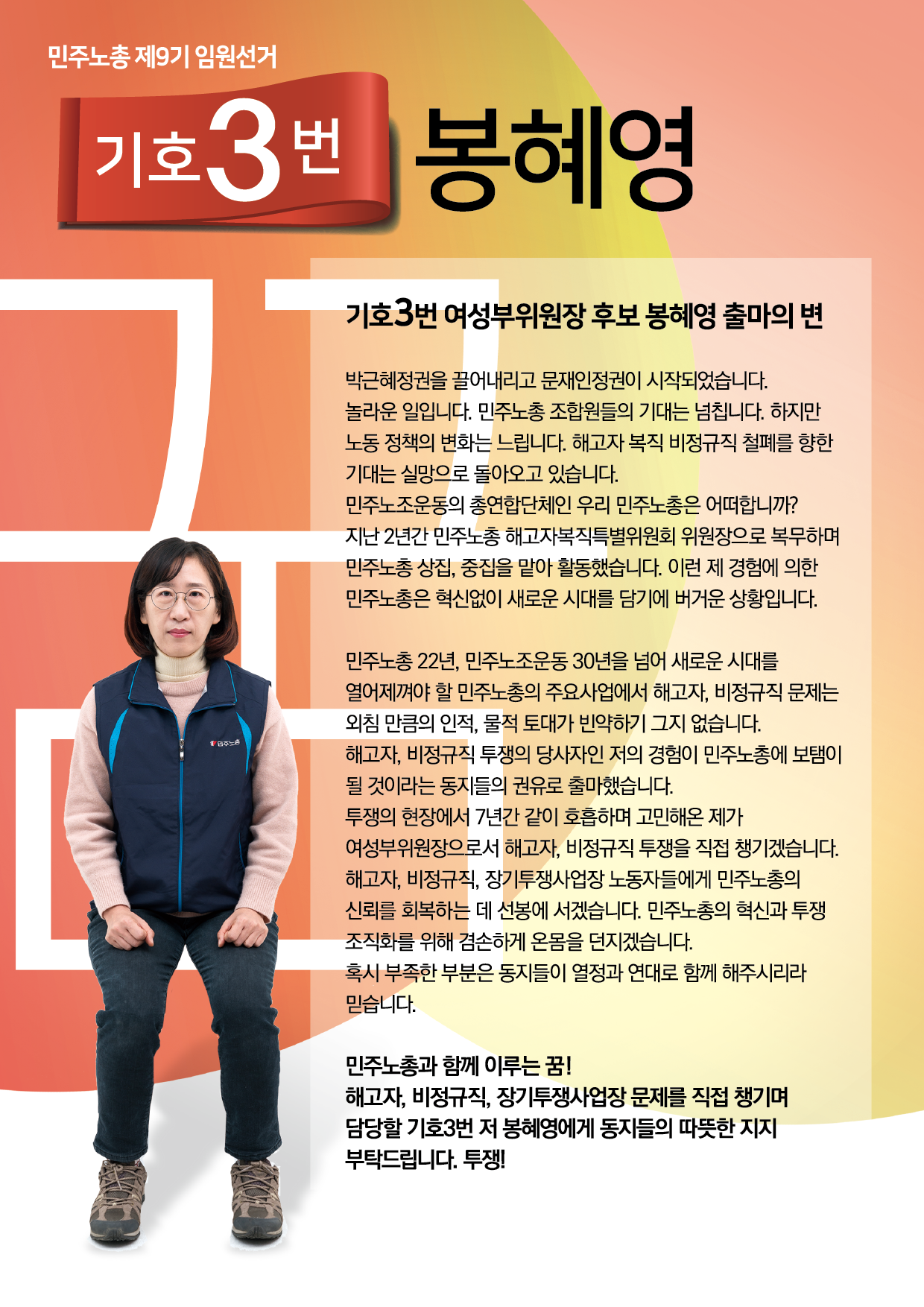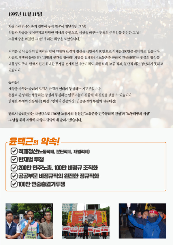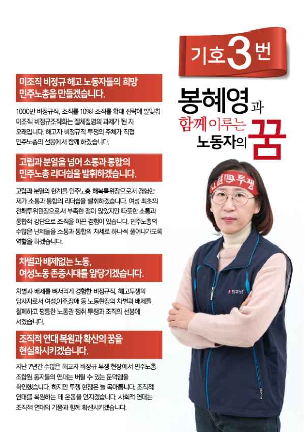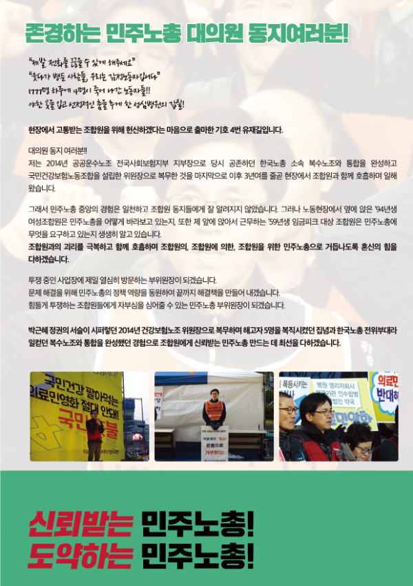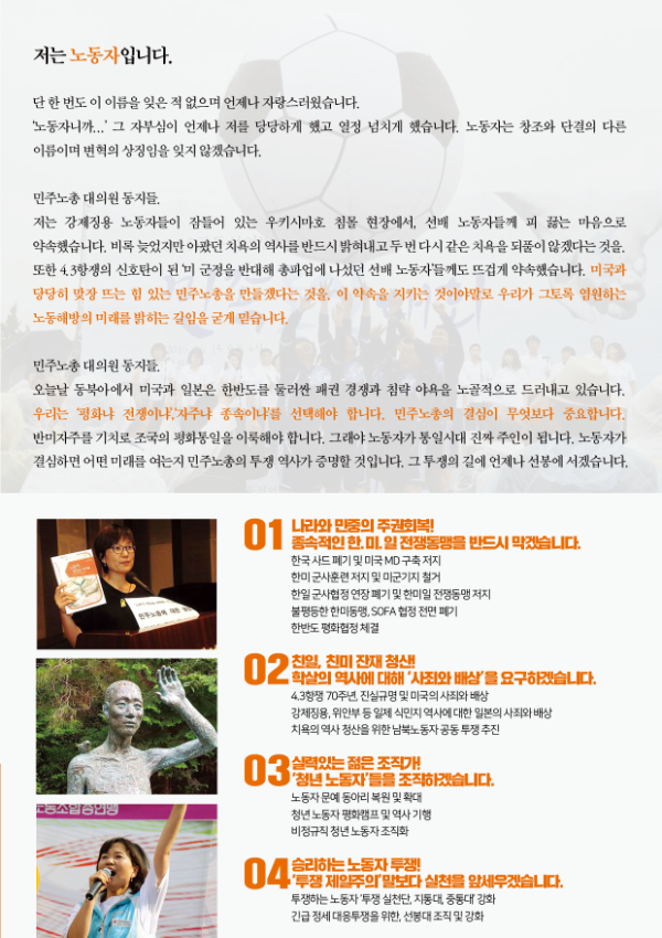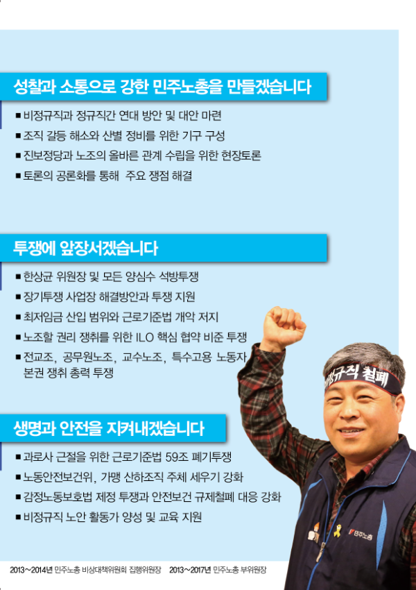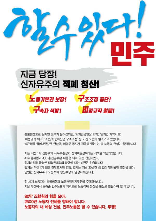 민주노총 선거 관련 웹자보 자료를 모아놓은 아카이브이다. 여기에는 민주노총 임원 선거에 사용된 다양한 후보들의 홍보 자료와 공약, 이력 정보가 포함되어 있다. 2018년 2월에 진행된 제9기 임원선거 관련 정보도 일부 포함되어 있으며, 선거 일정 및 후보자 정보 등을 확인할 수 있다. 자료들은 노동자들의 권익 향상과 사회적 연대를 강조하는 내용을 담고 있다.