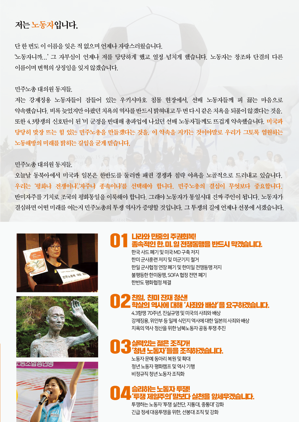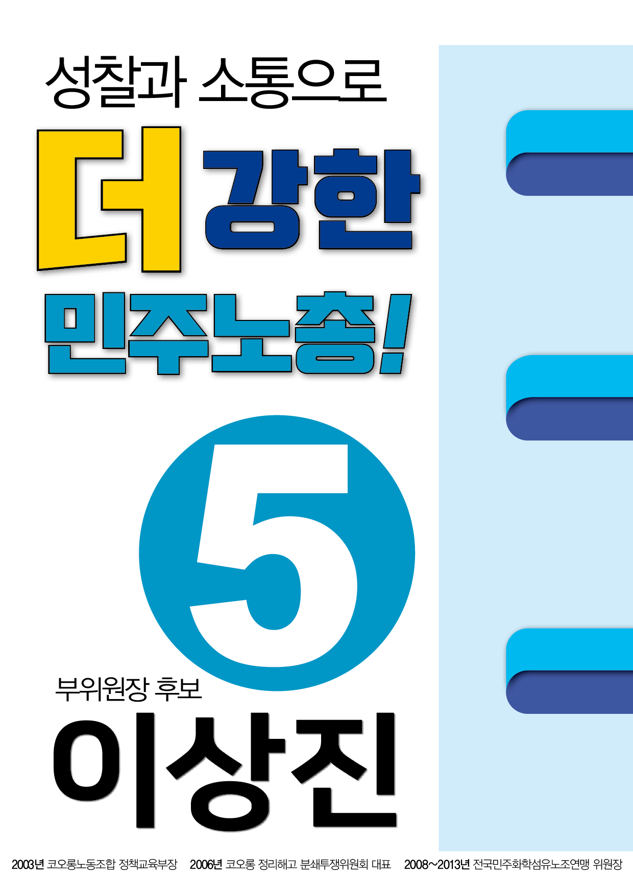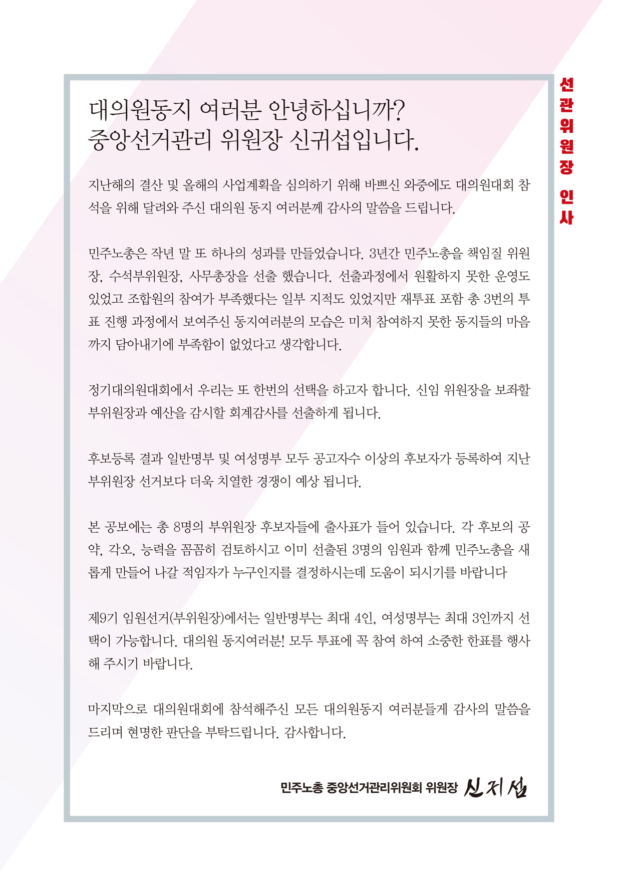 민주노총 선거 관련 웹자보 자료를 모아놓은 아카이브이다. 여기에는 민주노총 임원 선거에 사용된 다양한 후보들의 홍보 자료와 공약, 이력 정보가 포함되어 있다. 2018년 2월에 진행된 제9기 임원선거 관련 정보도 일부 포함되어 있으며, 선거 일정 및 후보자 정보 등을 확인할 수 있다. 자료들은 노동자들의 권익 향상과 사회적 연대를 강조하는 내용을 담고 있다.