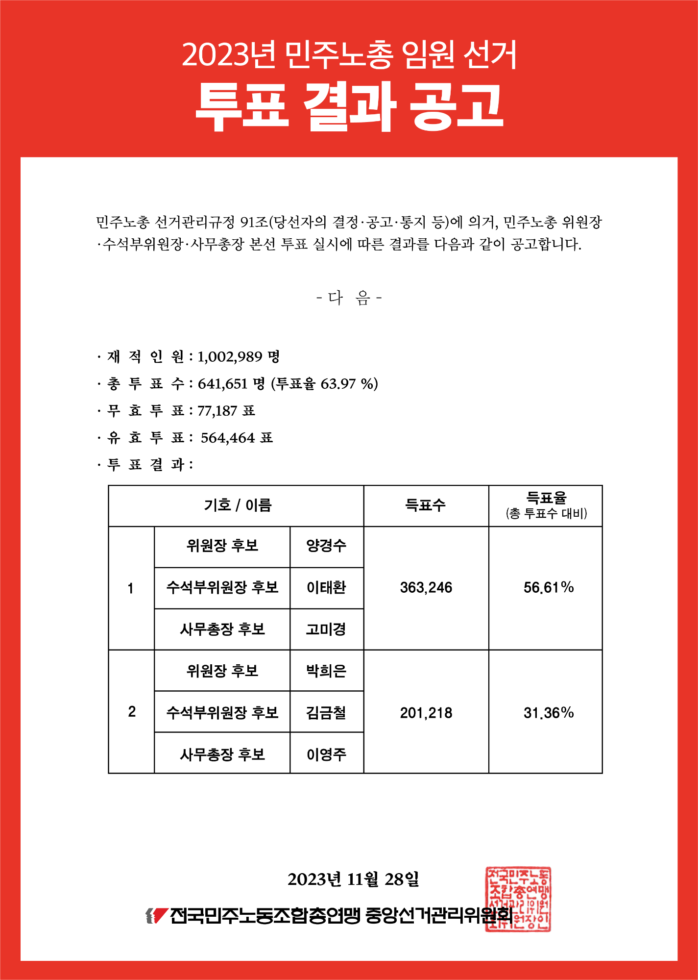 본 문서는 2023년 민주노총 임원 선거의 투표 결과를 공고하는 내용이다. 재적인원은 1,002,989명이며, 총 투표수는 641,651명으로 투표율은 63.97%이다. 무효 투표는 77,187표, 유효 투표는 564,464표이다. 위원장 후보 양경수, 수석부위원장 후보 이태환은 363,246표를 획득하여 56.61%의 득표율을 기록했다. 위원장 후보 박희은, 수석부위원장 후보 김금철은 201,218표를 획득하여 31.36%의 득표율을 나타냈다.