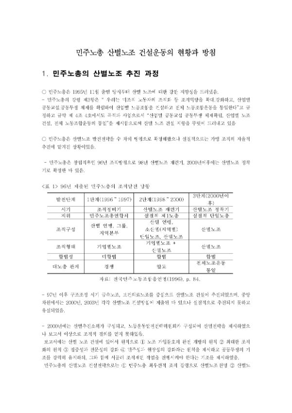 본 문서는 민주노총의 산별노조 건설운동의 현황과 방침을 담고 있다. 민주노총은 1995년 출범 당시부터 산별노조에 대한 강한 지향성을 드러냈으며, 산별노조 발전전략을 수 차례 방침으로 확정해왔다. 2006년 민주노총은 중앙위에서 확정된 사업방침 속에서 6월 산별전환투표를 통해 전조직이 산별전환하기로 결의했다. 2006년 5월말 현재 민주노총 소속 노동조합의 가입형태를 살펴보면 총 742개 노조 중에서 산별노조가 32곳, 42만 2천116명으로 전체 노조 수 대비 4.3%이며 전체 조합원수 대비 54.2%를 차지한다.