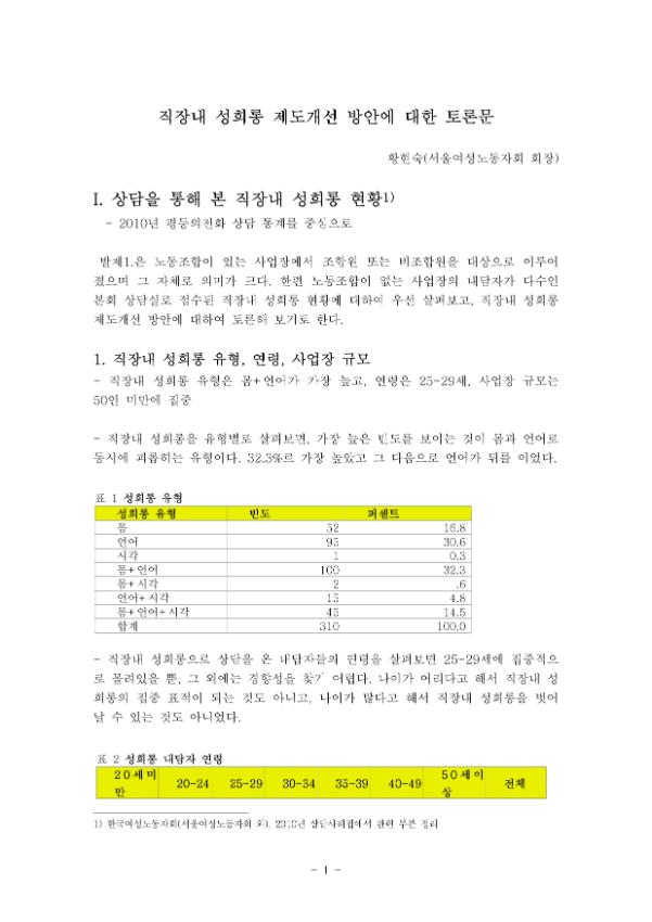 서울여성노동자회 상담실에 접수된 직장 내 성희롱 현황을 분석하고 제도 개선 방안을 토론하는 내용이다. 2010년 평등의 전화 상담 통계를 중심으로 성희롱 유형, 연령, 사업장 규모 등을 분석했다. 성희롱 유형은 몸과 언어가 동시에 가해지는 경우가 가장 많았으며, 25-29세 연령대에서 가장 많이 발생했다. 50인 미만 사업장에서 성희롱 발생 빈도가 높았고, 제조업과 사무직에서 주로 발생했다. 사업주와 상급자의 성희롱 예방 교육 참여를 의무화하고, 고객에 의한 성희롱에 대한 법제화 이후 상담이 증가했음을 지적했다.