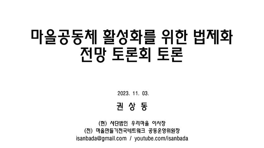 11월 3일 '경기도마을공동체지원센터'에서 개최한 「마을공동체 활성화를 위한 법제화 전망 토론회」 자료입니다.