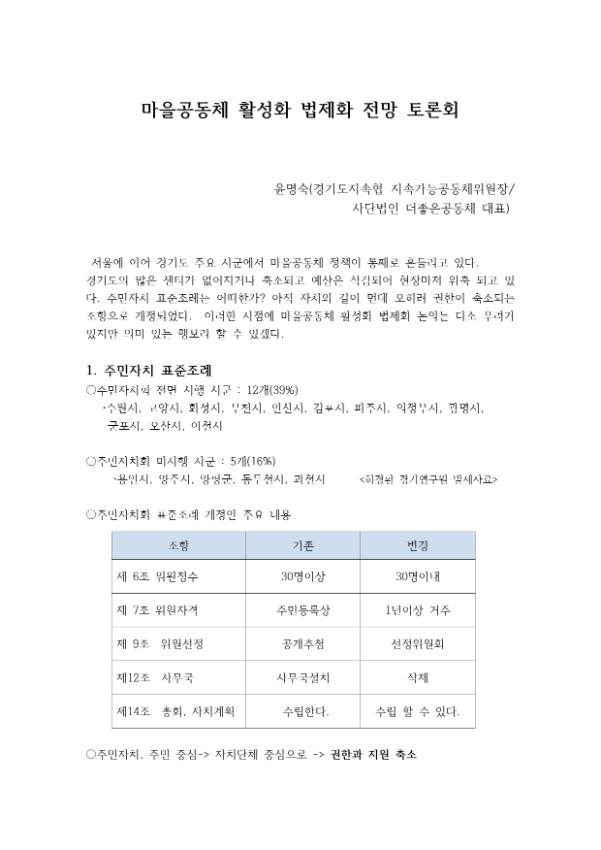 11월 3일 '경기도마을공동체지원센터'에서 개최한 「마을공동체 활성화를 위한 법제화 전망 토론회」 자료입니다.