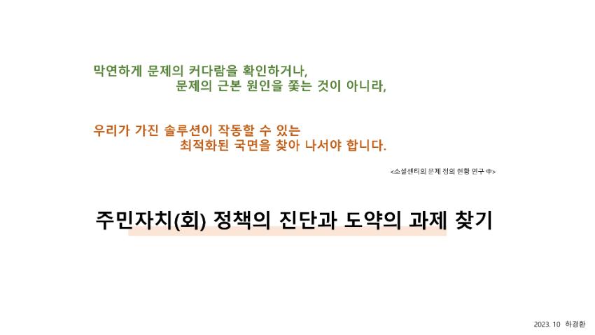 "제14회 마을만들기 전국대회 in 수원(2023.10.18~20)" 컨퍼런스 발제자료입니다.