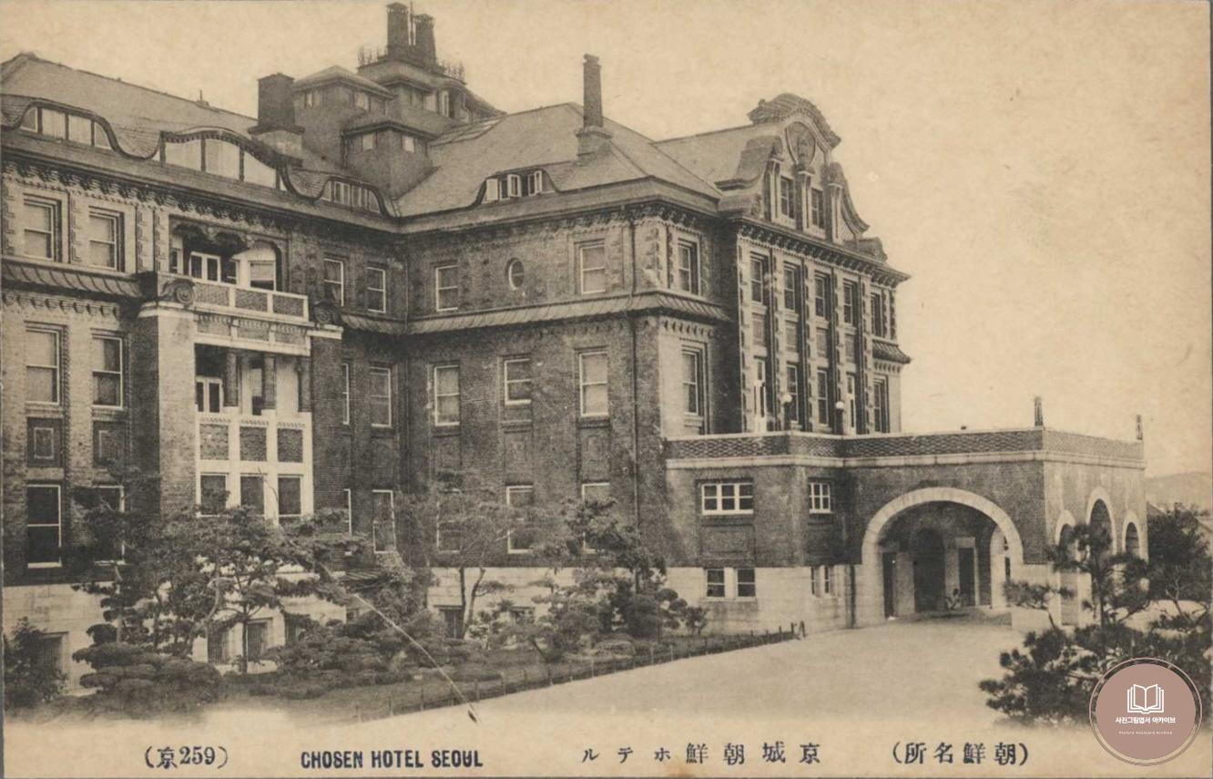 1920년대 경성의 대표적인 엽서 발행처 '일출상행(히노데)'에서 발행한 조선명소 시리즈 중 조선호텔 정문 모습을 담은 사진그림엽서이다. 조선명소 시리즈 중 259京에 해당하는 자료이고, 조선호텔은 오늘날까지 그 역사가 계승되어 이어지고 있다.