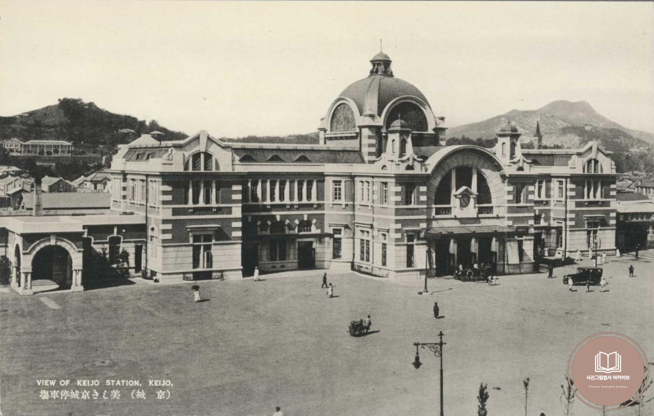 1930년대 다이쇼사진공예소(大正寫眞工藝所)와 와카야마 인쇄소에서 제작 및 발행한 '대경성의 신풍경' 16장 사진그림엽서 중 하나인 서울역의 모습이다.