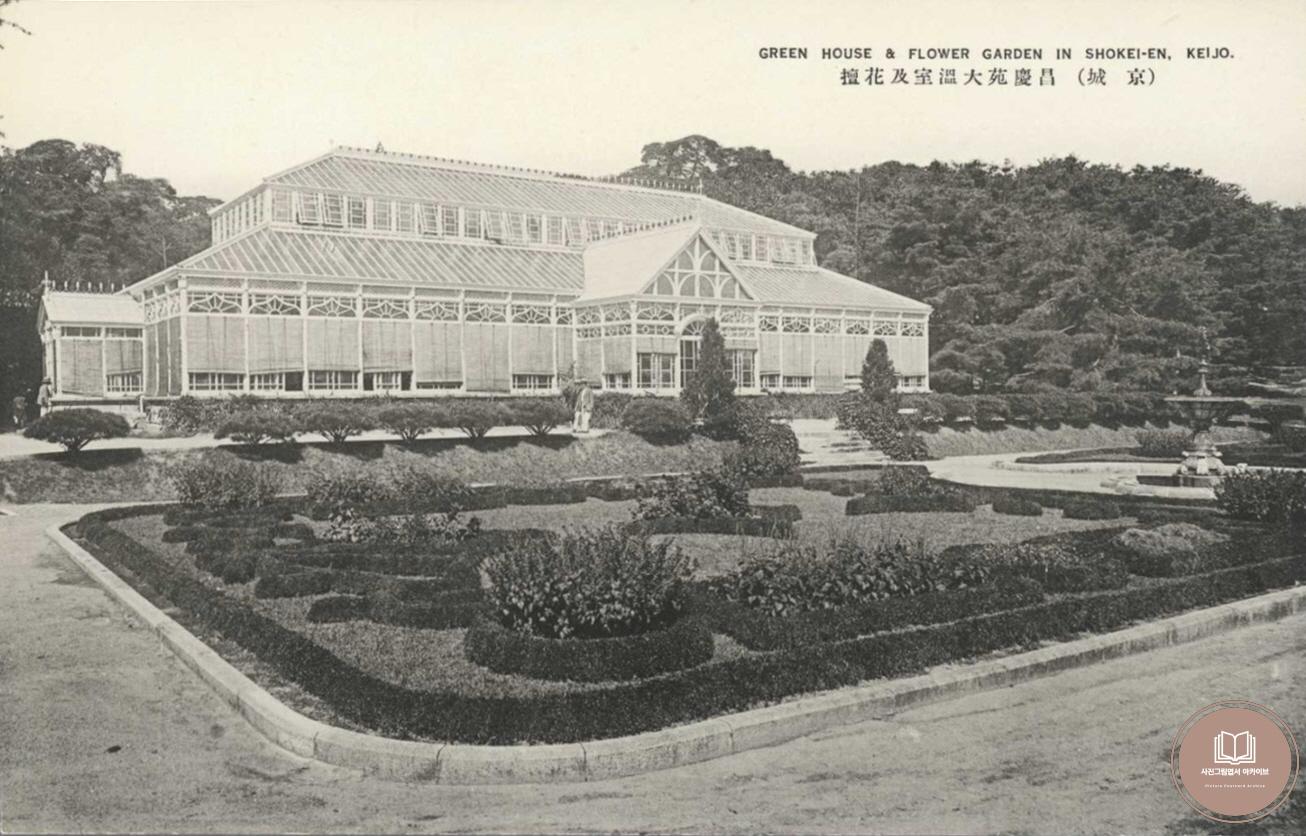 1930년대 다이쇼사진공예소(大正寫眞工藝所)와 와카야마 인쇄소에서 제작 및 발행한 '대경성의 신풍경' 16장 사진그림엽서 세트 중 창경궁 유리온실의 모습을 수록한 기록이다. 유리온실 혹은 대온실로 불리는 창경궁 내 근대 서양식 정원은 1909년 11월 1일 개관한 곳이다. 1905년 외교권 박탈과 1907년 군권 강탈 등 일제는 대한제국에 대한 내정간섭을 노골화했다. 이에 1909년 사실상 창덕궁에 유폐된 순종을 일제가 위로하고자 창경궁을 유원지로 개조하여 동물원과 식물원을 세우고 창경원으로 이름을 격하시켰다. 이때 춘당지 북쪽, 관덕정 서쪽 일원에 대규모의 식물원 가설을 추진한다. 설계는 일본인 원예학자 후쿠바 하야토가 맡았고, 시공은 프랑스의 한 업체가 진행했다. 1년 정도의 공사를 거친 후 대온실이 개장했고, 개장 당시 한국 최초의 서양식 온실이면서 동양 최대 규모였다.