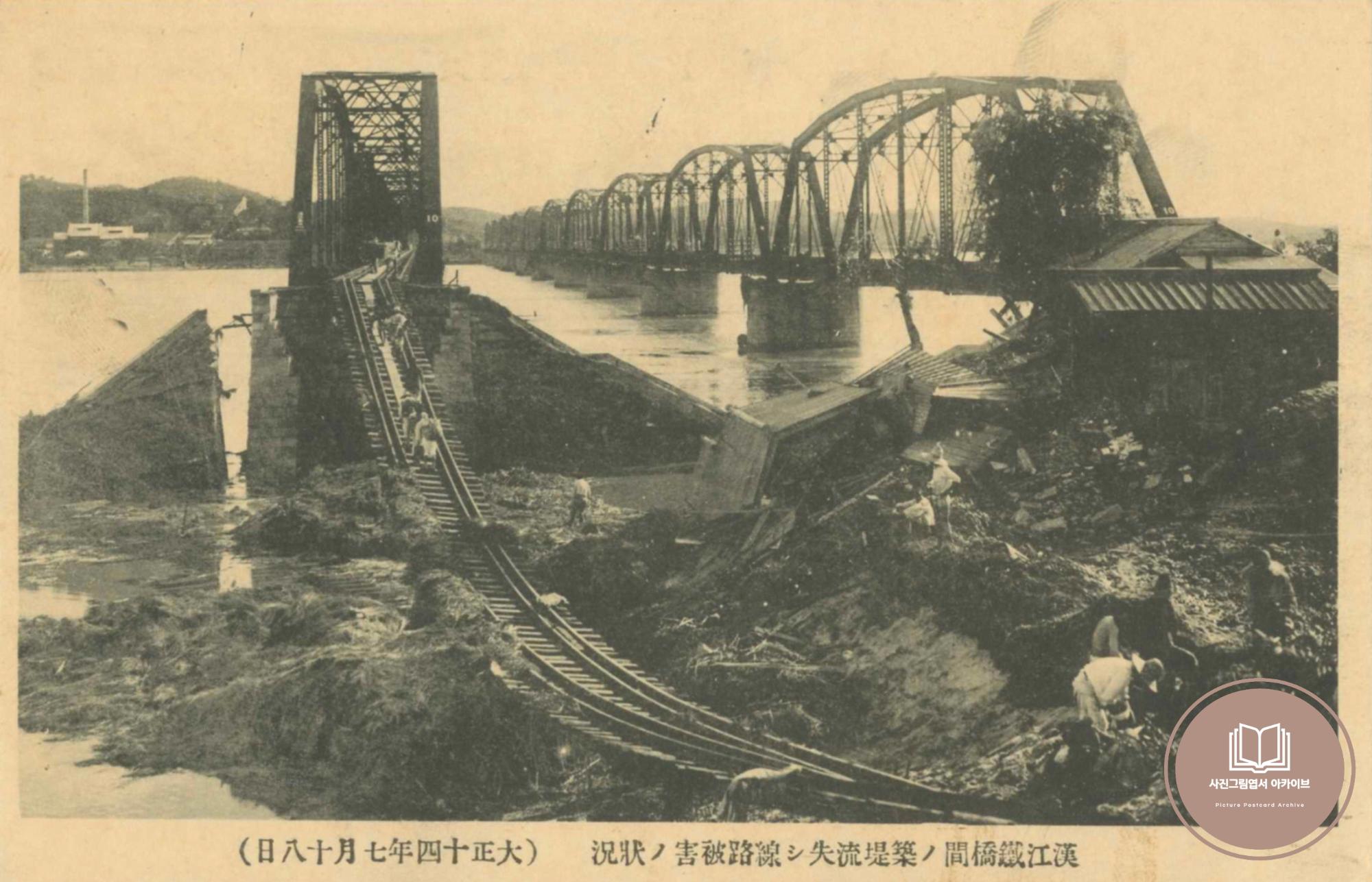 1925년 07월 18일에 발생한 한강대홍수로 인해 발생한 피해상황을 기록한 사진그림엽서이다. 본 자료는 한강대홍수 기간 중 한강철교 북단 일부가 유실된 모습을 담고있다.