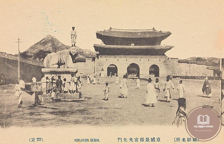 1910년대 사진그림엽서 발행처 중 하나인 일출상행(히노데, 日之出常行)에서 발매한 조선명소 시리즈 중 '23京'에 해당하는 광화문과 해치상 모습이다. 광화문은 조선의 법궁 경복궁의 정문으로 흥선대원군 집권기에 중건된 건물이다. 본 사진그림엽서 속 광화문의 모습은 뒷편에 북악산과 근정문의 모습을 확인할 수 있으므로, 조선총독부 건축을 위한 가설공사 이전 즉 식민통치 초창기의 모습으로 추정할 수 있다.