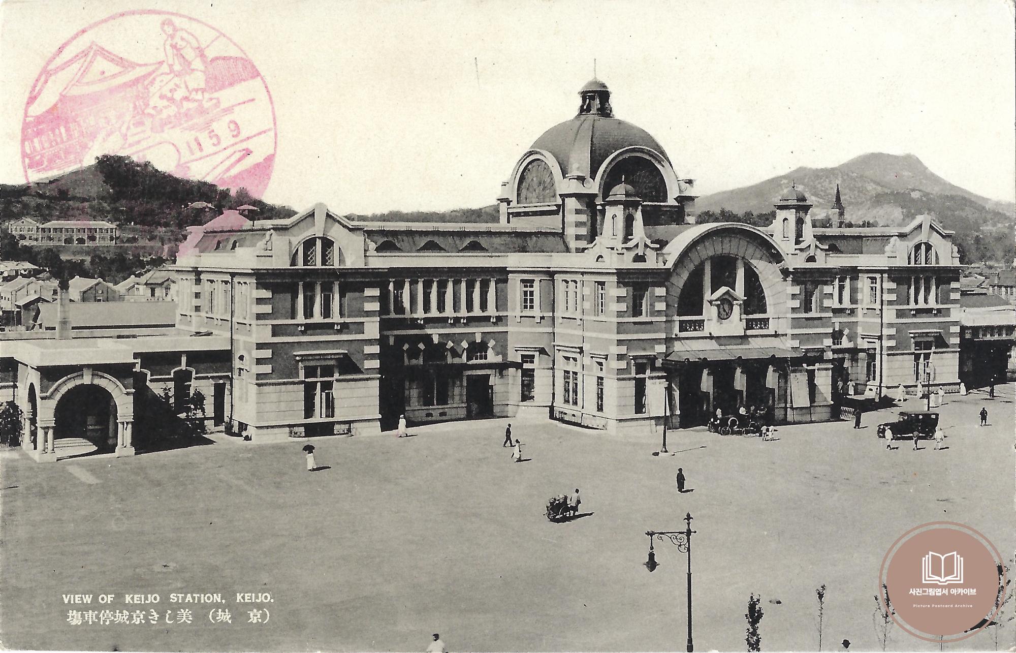 1936년 다이쇼사진공예소(大正寫眞工藝所)에서 발행한 '대경성의 신풍경' 16매 사진그림엽서 중 서울역 모습이 담긴 기록이다. 1900년 경성 정차장으로 시작한 서울역은 1925년 9월 남만주철도 주식회사에서 (네오)르네상스식 건축물로 새롭게 신축하며, 정차장에서 경성역으로 개명했다.