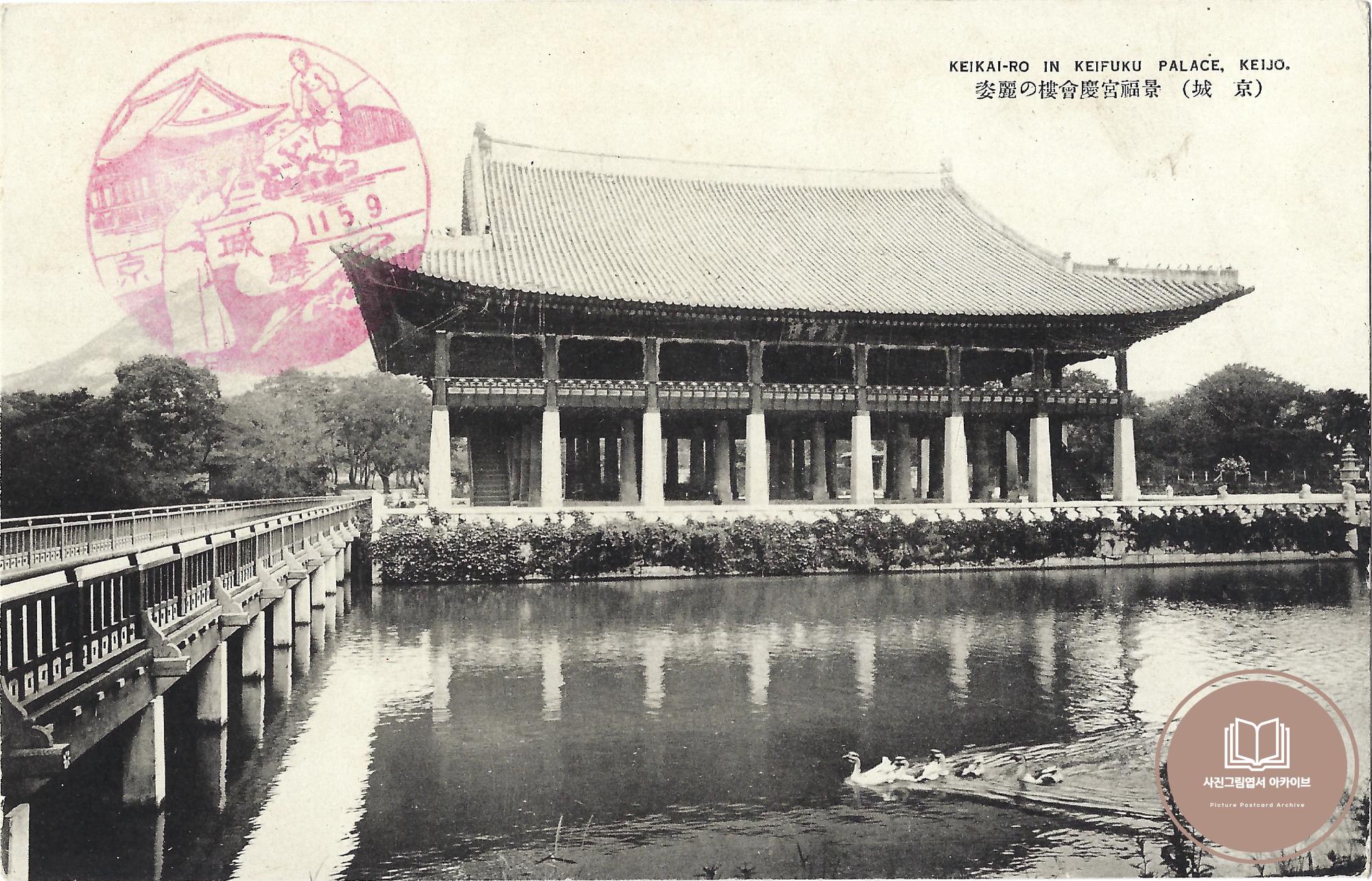 1936년 다이쇼사진공예소(大正寫眞工藝所)에서 발행한 '대경성의 신풍경' 16매 사진그림엽서 중 경복궁 경회루의 모습을 담은 자료이다. 경회루는 경복궁의 정전인 근정전의 서측에 위치한 누각으로 현존하는 한국 최대의 목조 누각이다. 본래 1395년 경복궁 창건 당시에 없었던 시설로 1412년 태종연간에 신규 건축된 것이다. 1474년 오늘날의 모습과 유사하게 대대적인 개축이 이뤄졌고, 1592년 임진왜란 당시 백성들에 의해 불탔던 것을 구한말 흥선대원군이 경복궁 중건을 도모하며 함께 복원한 것이 오늘날까지 전해진다.
