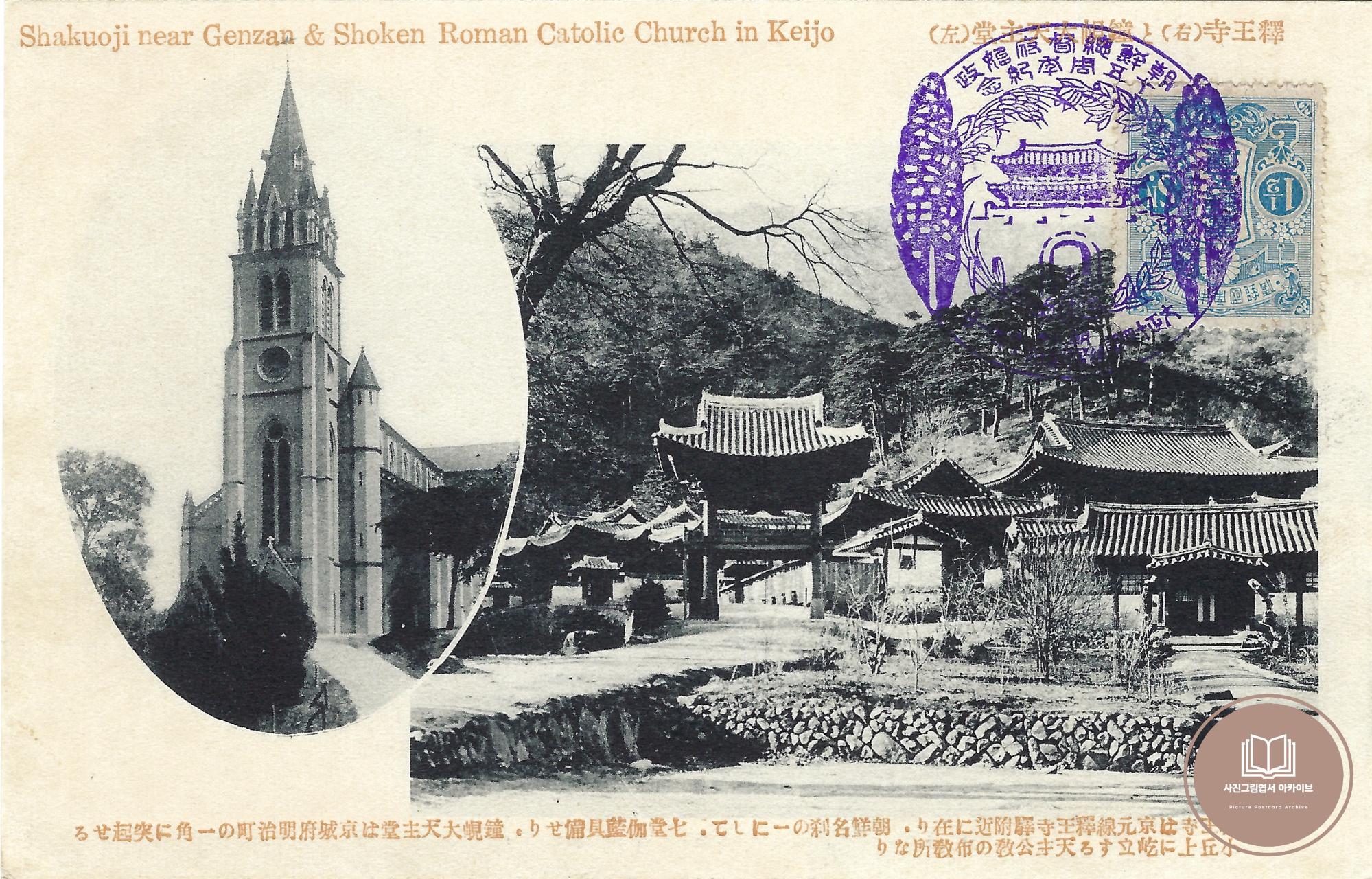 1925년 조선총독부에서 발행한 조선회엽서 제2집 사진그림엽서 중 석왕사와 명동(종현)성당 모습이 담긴 기록이다. 석왕사는 현재 북한 강원도 고산군 설봉리에 위치한 사찰로 경원선 축선에 위치한 대표적인 관광지 중 한 곳이다. 엽서 좌측에는 종현성당이라는 특이한 이름의 성당이 수록되어있는데, 종현성당은 명동성당의 완공 당시에 일컫는 명칭으로 종현(鐘峴) 언덕에 지어진 성당이란 의미를 지닌다.