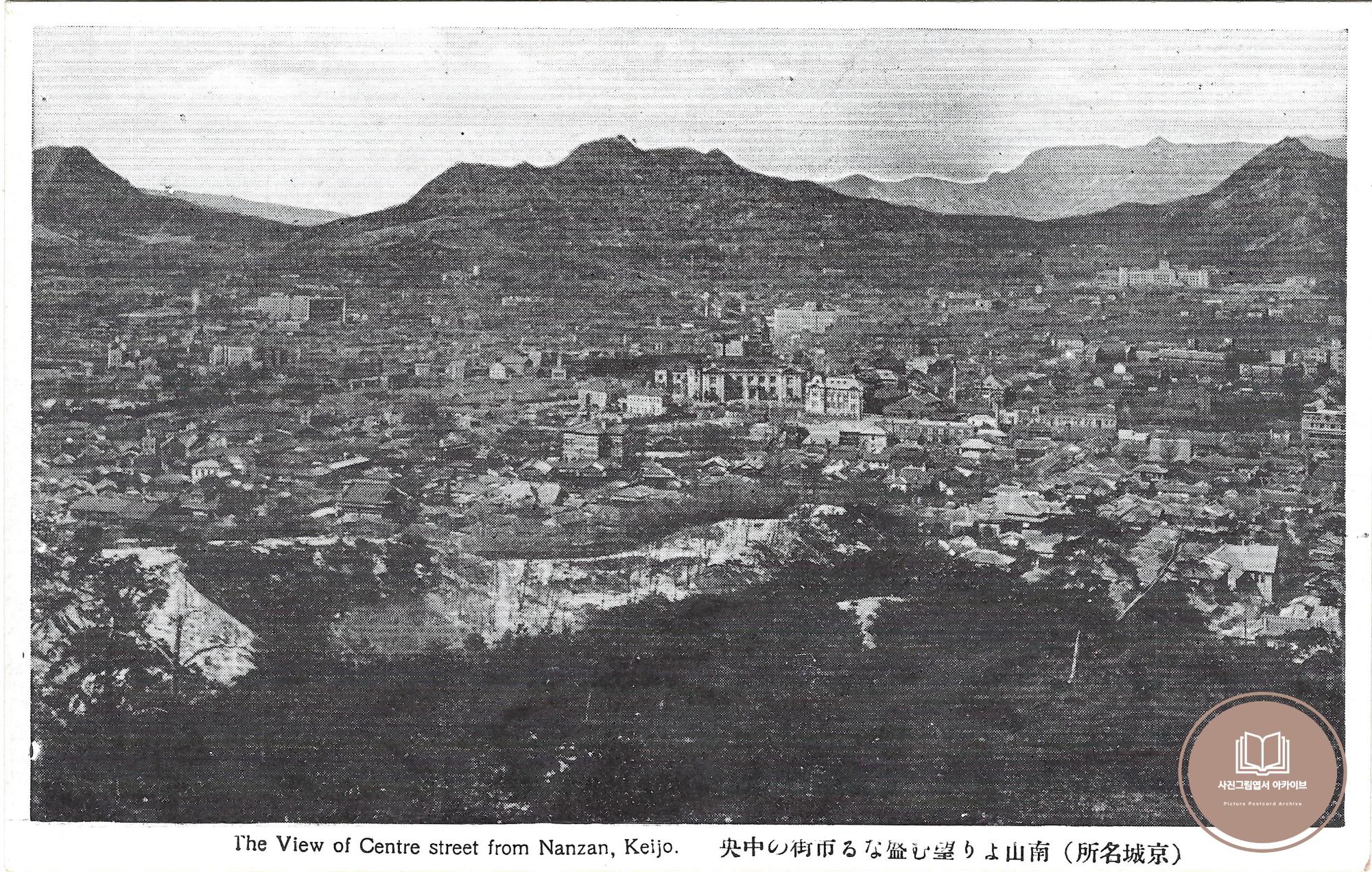 1930년대 발행된 것으로 추정되는 경성명소 남산에서 바라본 경성 시가지 중앙 모습이 담긴 사진그림엽서이다. 정확한 발행시기를 예상할 수 없으나, 전반적으로 시가지 내에 조선총독부 청사와 경성부 청사, 조선은행 등 식민지 지배에 필요한 주요 청사가 신축되어 완공된 모습을 보이고 있다.