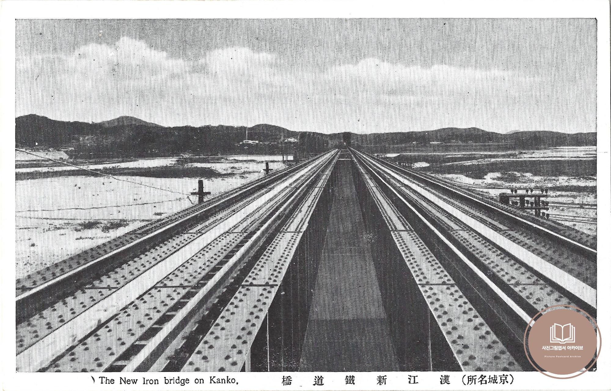 1930년대 발행한 것으로 추정되는 경성명소 한강 신 철도교 사진그림엽서이다. 한강에 새롭게 개설된 철근 구조물 형태의 철도교 모습을 담은 기록이다.
