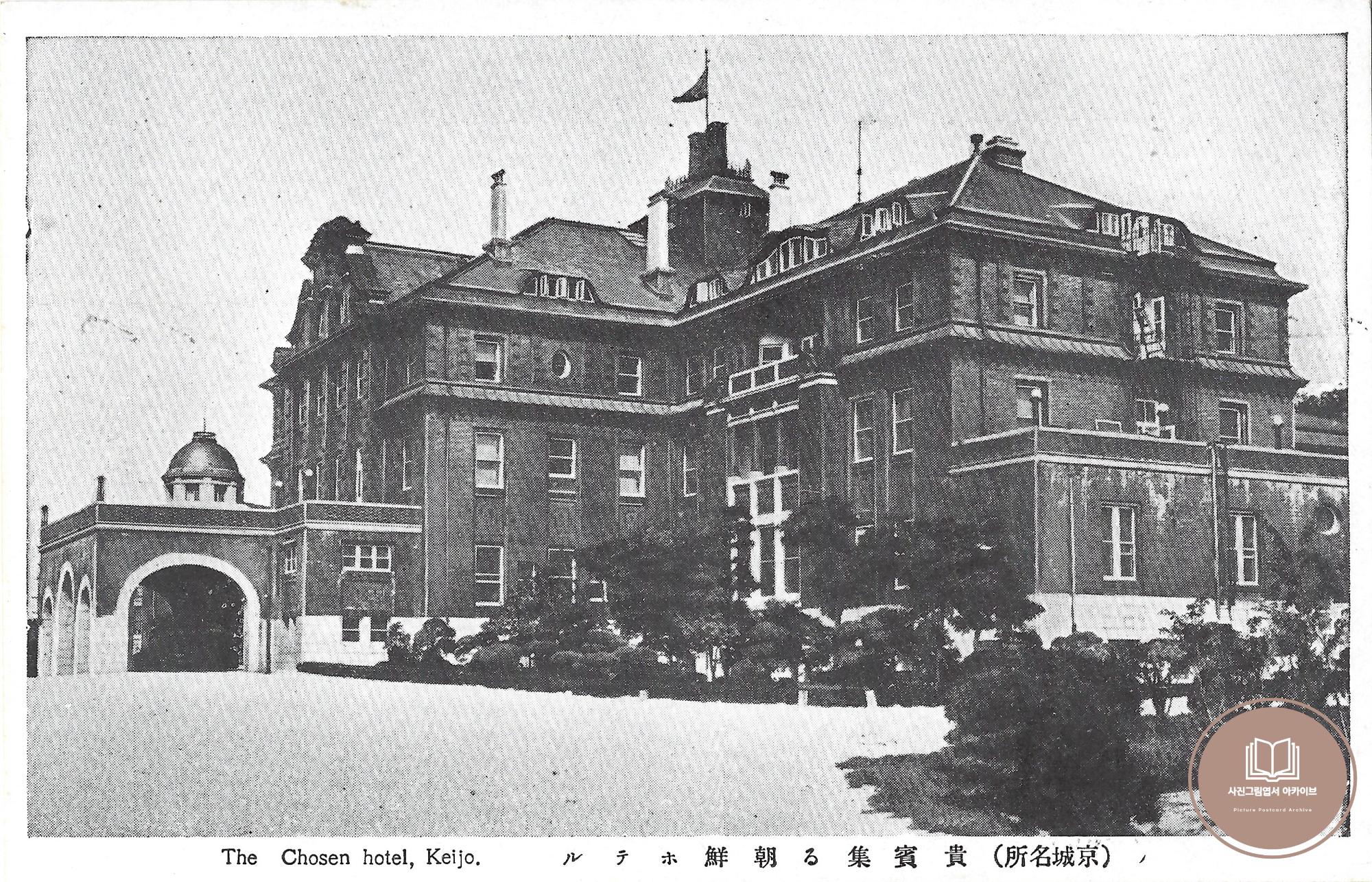 1930년대 발행된 것으로 추정되는 경성명소 사진그림엽서 세트 중 조선호텔 모습이 담긴 자료이다. 조선호텔은 조선총독부에서 경성에 방문한 외국인과 내지인의 숙박을 위한 고급 시설 건립을 추진하며 건립이 시작되었다. 조선총독부철도국 산하 기관으로 대한제국 환구단 일부를 허물고 1914년 10월 10일 서양식 호텔인 조선호텔을 개관한다. 조선호텔은 조선총독부와 경성역을 오가는 중간 지점에 위치하였고, 근처의 오늘날 명동으로 일컫는 본정(本町, 혼마치)도 있어서 최적의 위치였다. 현재 조선호텔 자리에는 신세계그룹에서 운영하는 조선호텔과 롯데그룹이 운영하는 롯데호텔 본점이 위치한다.