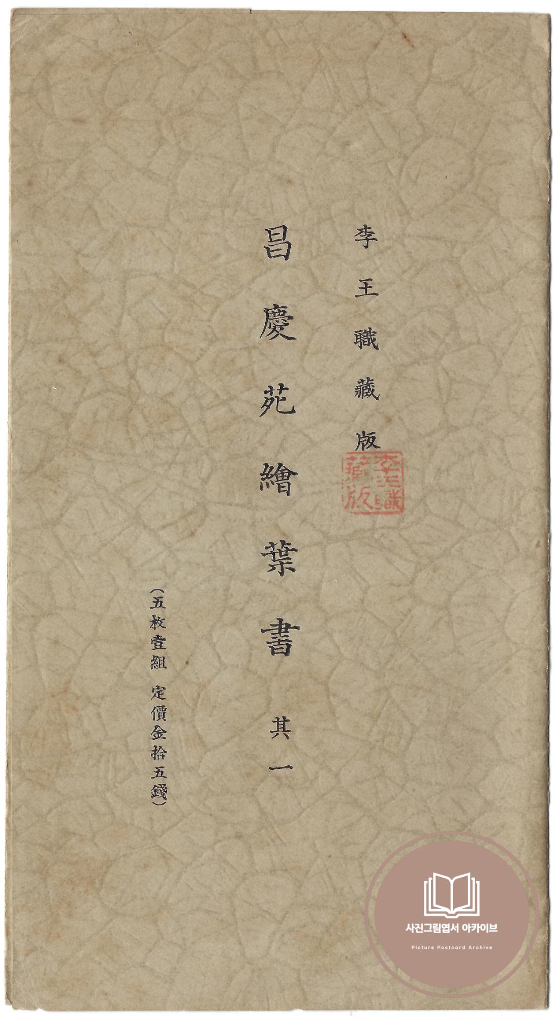 조선총독부 직속 기관인 이왕직(李王職)에서 1930년대 발행한 것으로 추정되는 창경궁 주요시설을 수록한 사진그림엽서 포장 봉투이다.